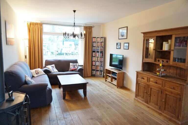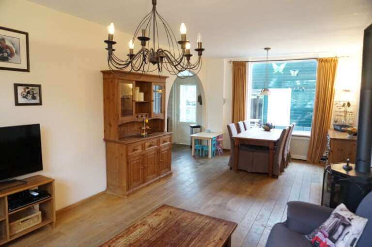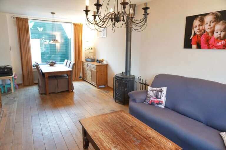Entree, toilet, hal met toegang naar de woonkamer met houten vloer en sfeervolle houtkachel en de half open keuken welke is voorzien van diverse inbouwapparatuur zoals een koel/vriescombinatie, oven, 4 pits gasfornuis, magnetron en vaatwasser.