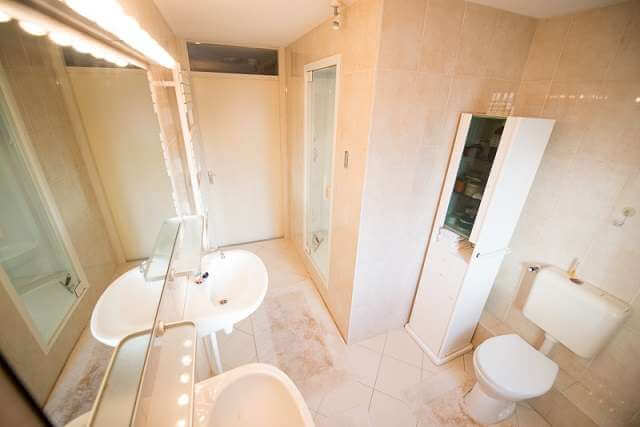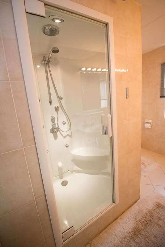 Overloop, ruime achterslaapkamer (oorspronkelijk 2 kamers) met uitzicht op het vaarwater, voor slaapkamer, moderne ruime badkamer voorzien van een luxe stoomcabine, 2 wastafels, toilet en douche.