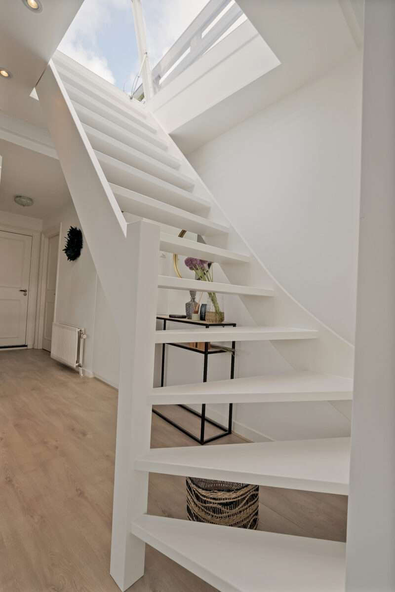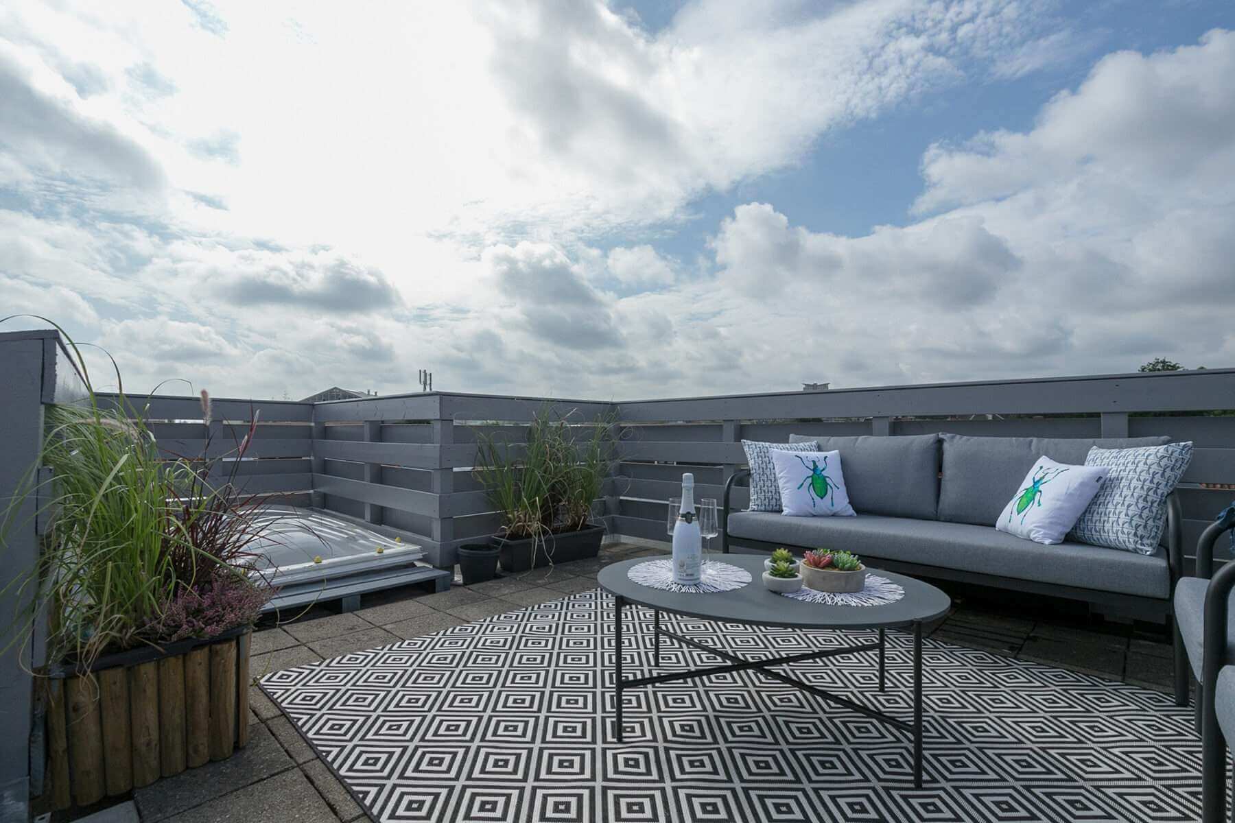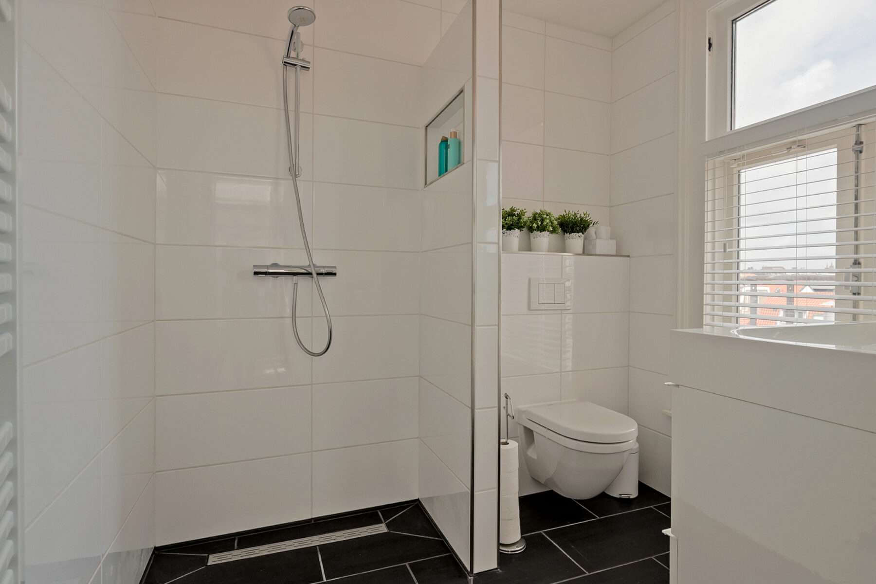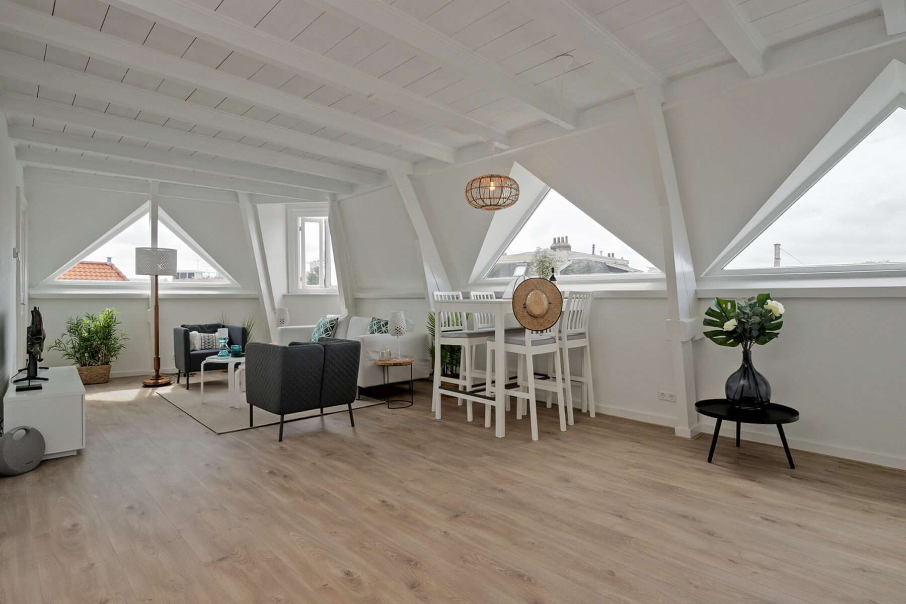 Het hoekhuis ligt op de 3e verdieping en heeft veel licht door de vele ramen. In de woonkamer leidt een trap naar het ruime dakterras.