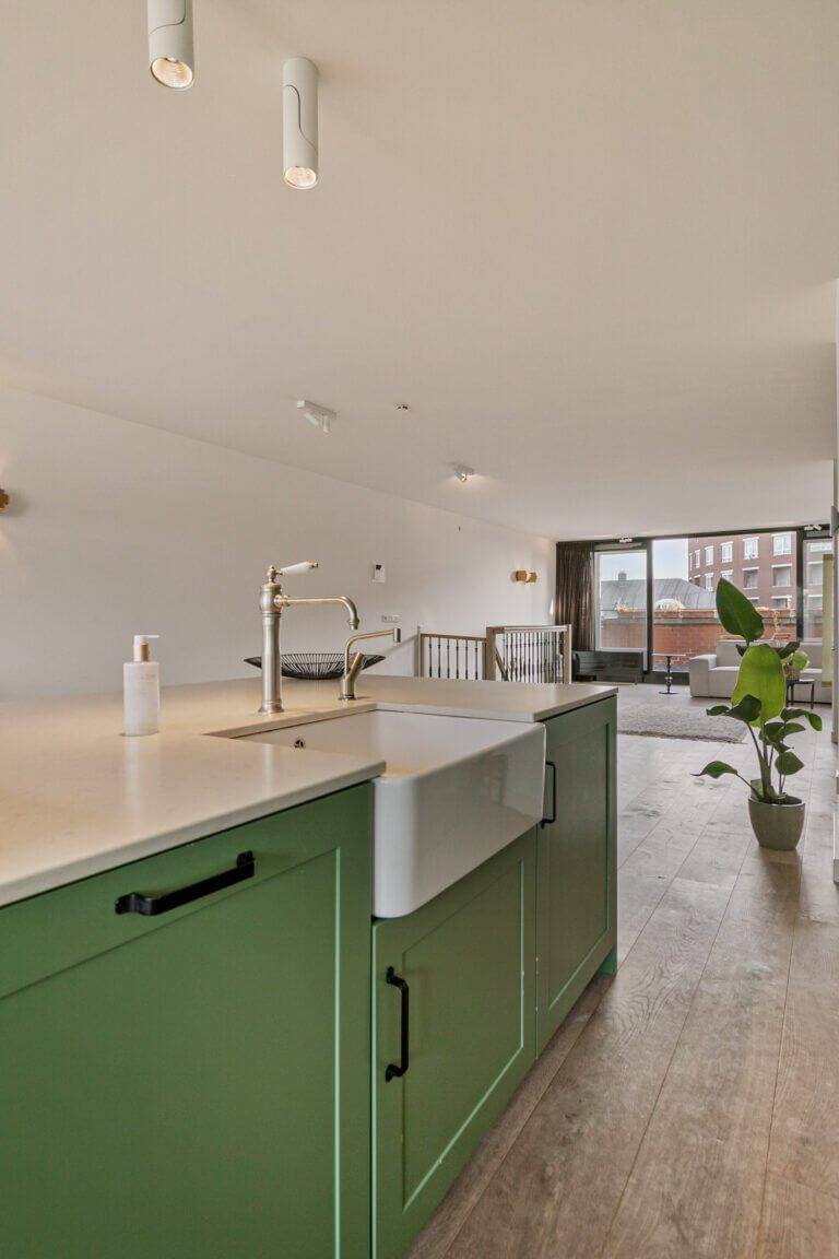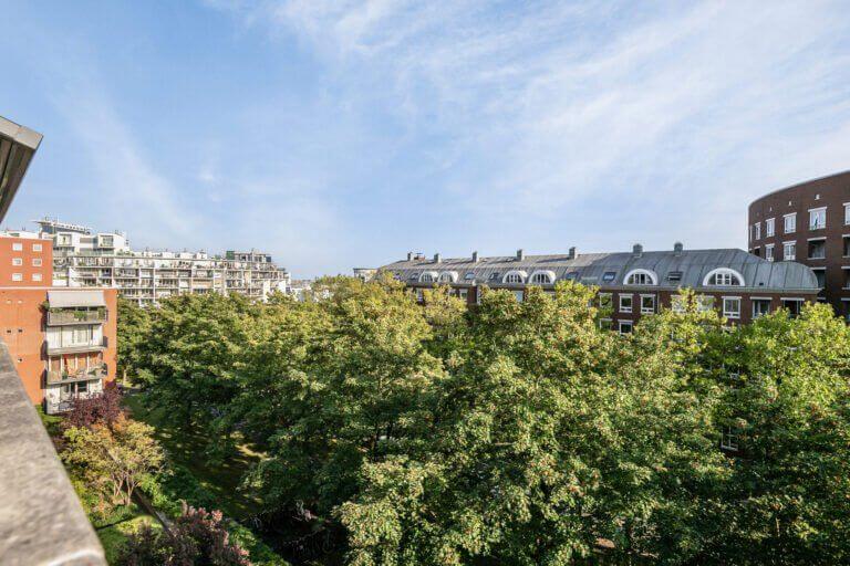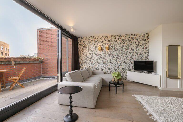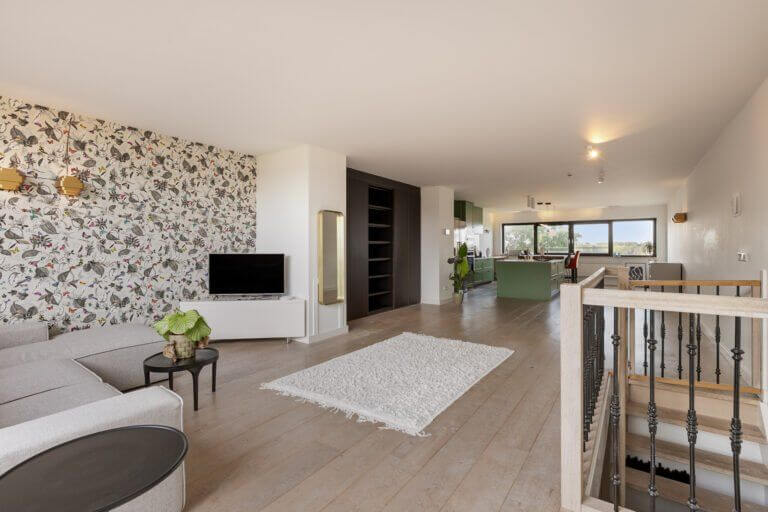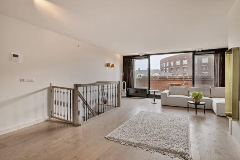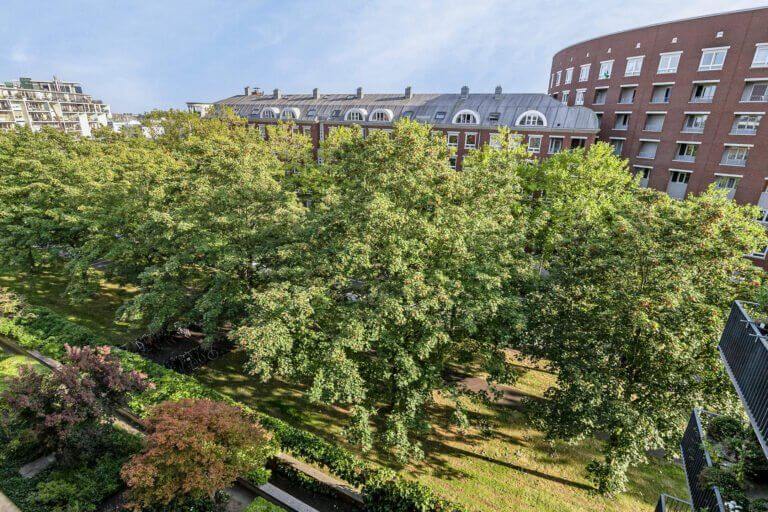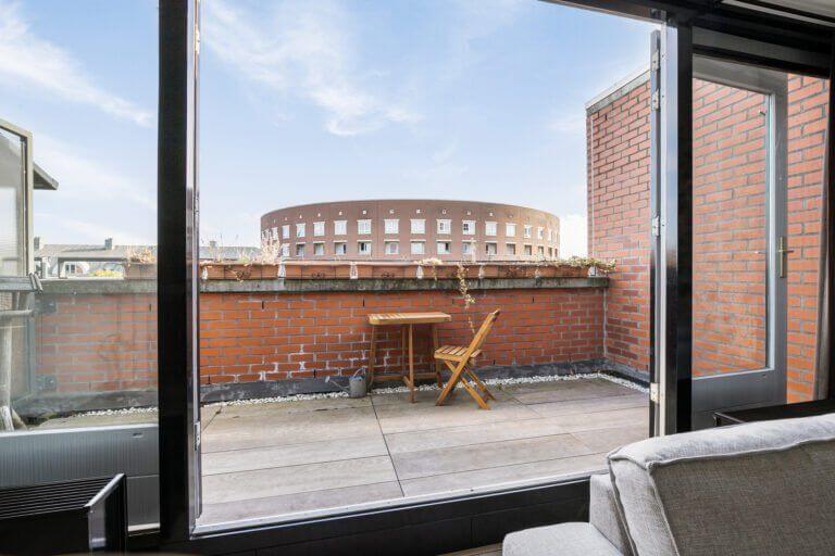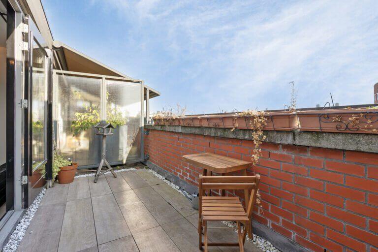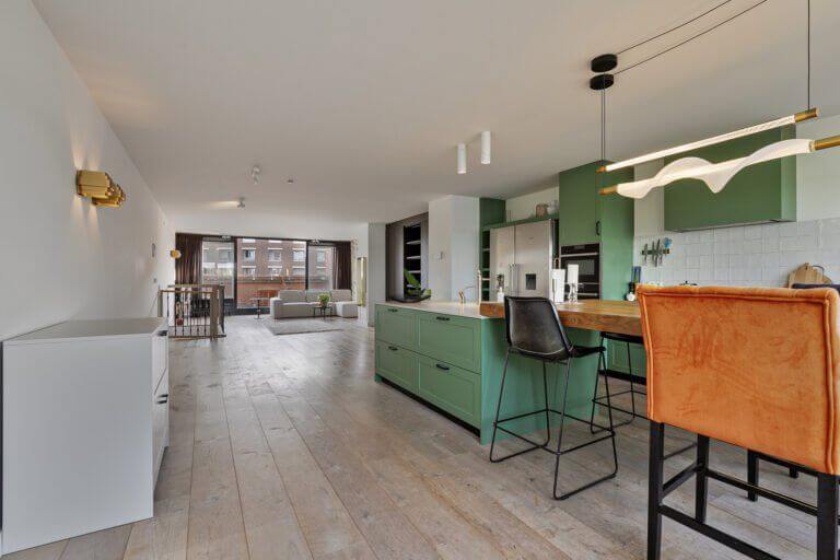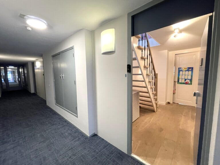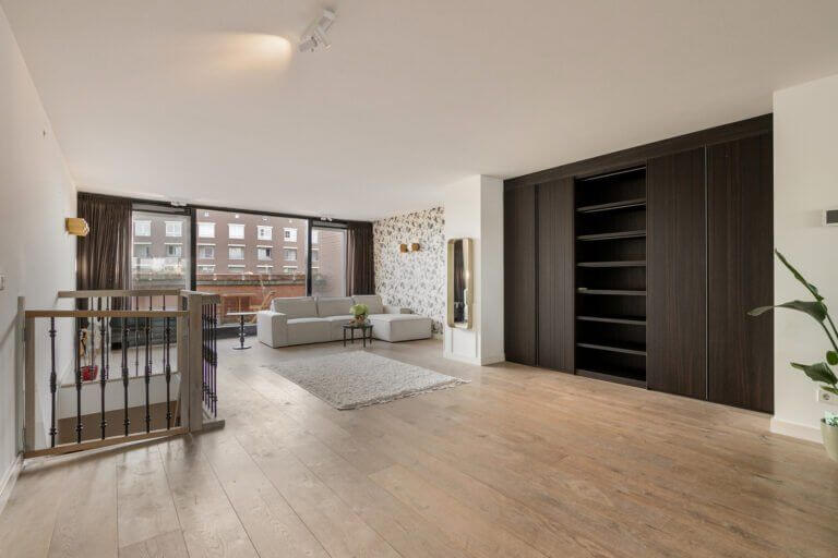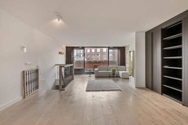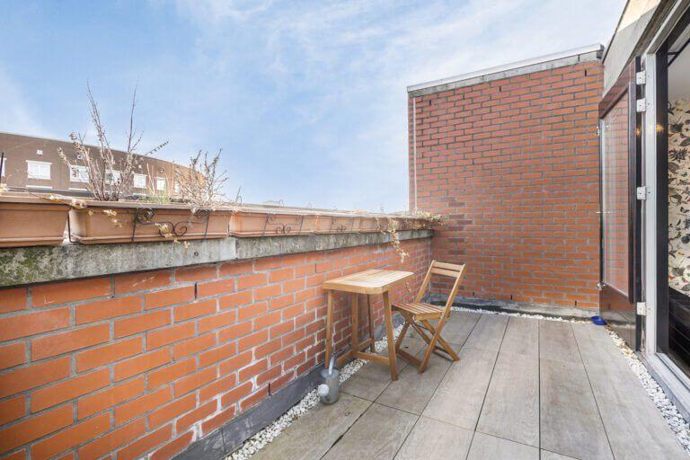 Een prachtige maisonnette met 2 slaapkamers (of een kantoor-aan-huis), badkamer en aparte toilet op de 4e verdieping en op de vijfde verdieping een grote woonkeuken, ruime en lichte woonkamer en zonnig terras van ruim 10m2 op het zuiden.
