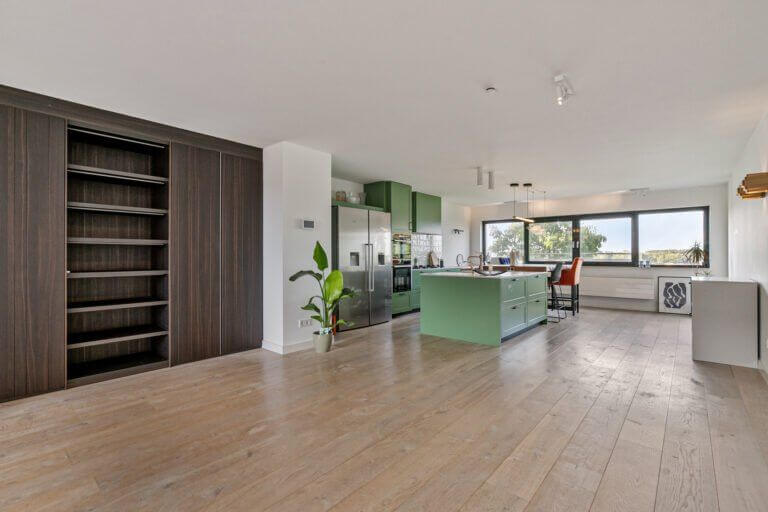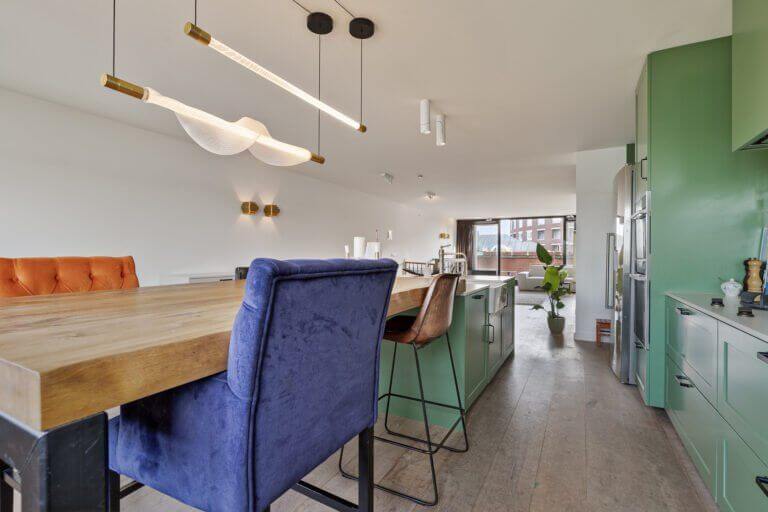 De ruime woning is gelegen op de bovenste (4e) verdieping, is voorzien van een balkon en heeft een fantastisch uitzicht over vaarwater ‘t IJ vanuit de keuken.