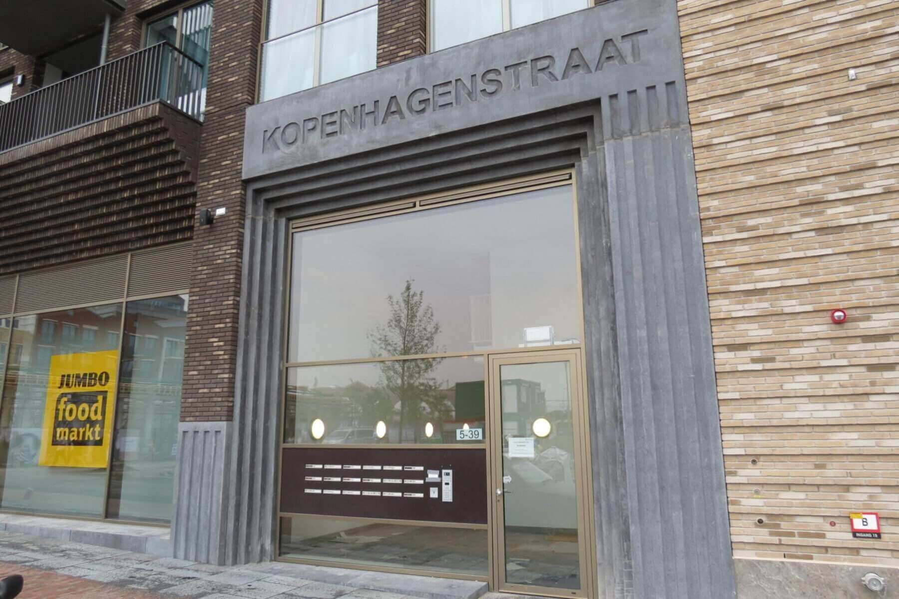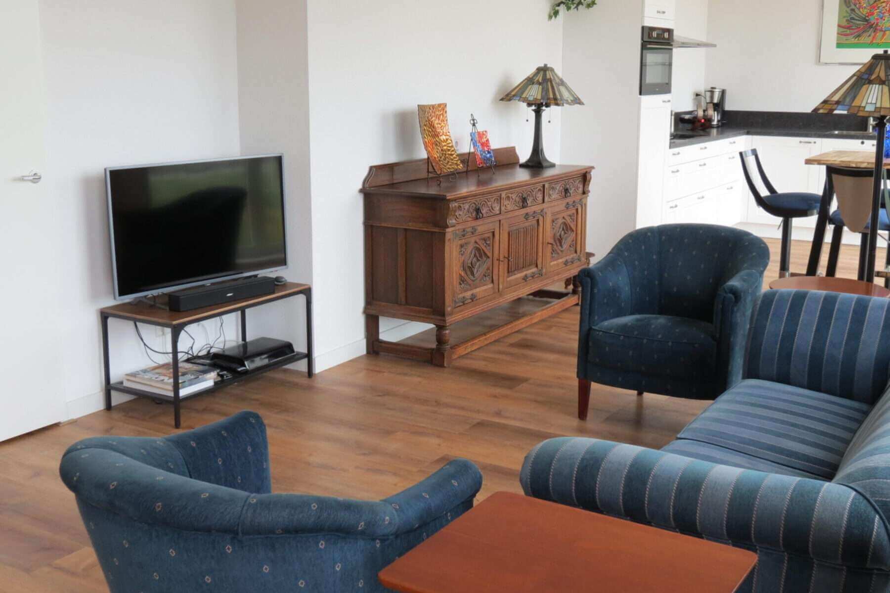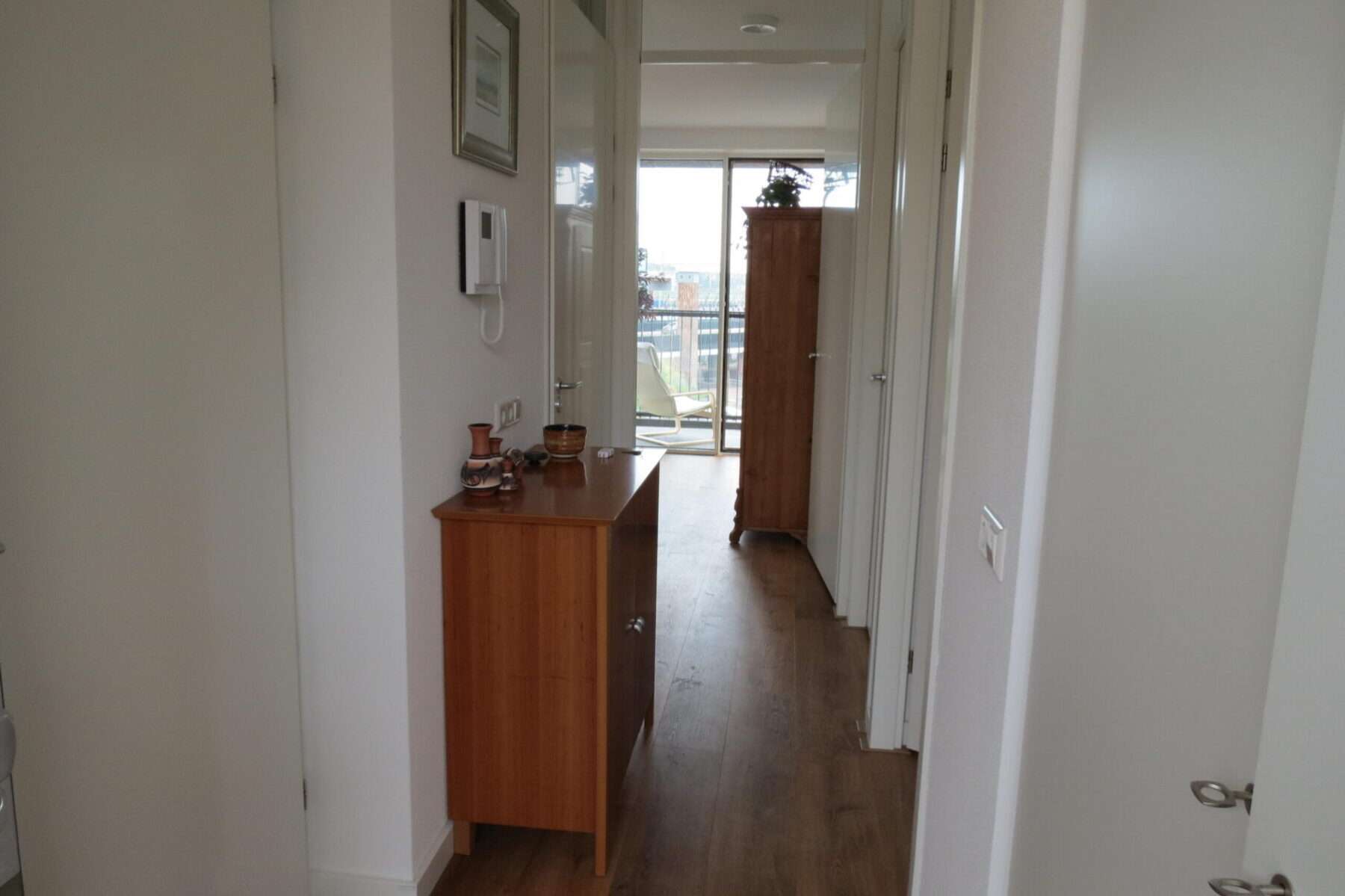 De entree brengt u in de gang welke toegang geeft tot twee slaapkamers van 14 en 8 m², het separate toilet, de badkamer en de woonkamer. In de badkamer is een douche, twee aparte wastafels en een design radiator. De grote slaapkamer heeft een tweepersoonsbed en een ruime kledingkast. De kleine slaapkamer bevat een 1-persoonsbed en ook een kledingkast. De woonkamer is opvallend licht met naar beneden doorlopende ramen en geeft toegang tot het balkon op het oosten. Tevens toegang naar een aparte bergruimte met hierin de wasmachine en wasdroger. Open keuken met fraaie hoekopstelling met vaatwasser, afzuigkap, inductiekookplaat, combimagnetron en koelkast.