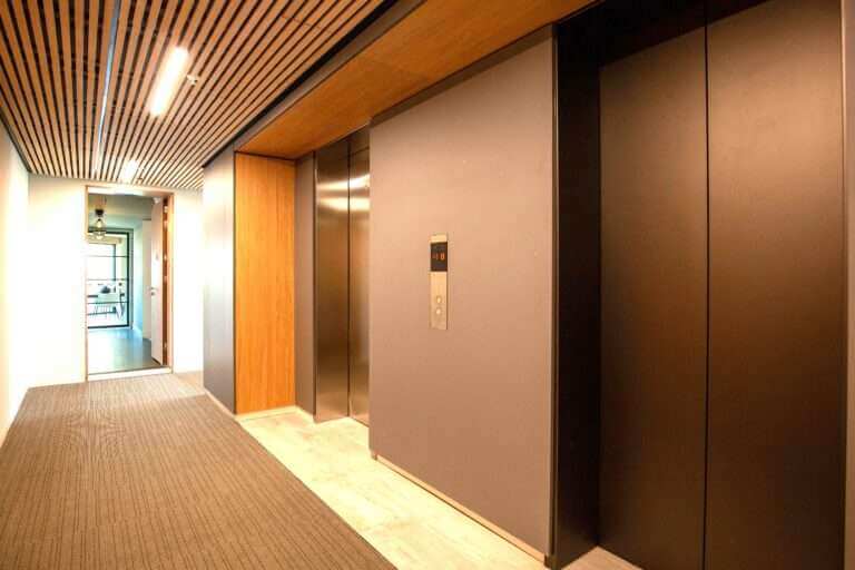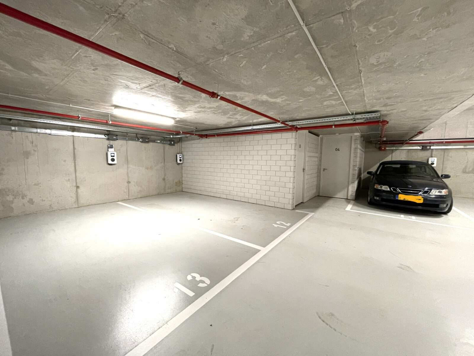 Privé parkeerplaats in de inpandige garage, gezamenlijke fietsenstalling. De woning is direct vanuit de garage per lift bereikbaar.