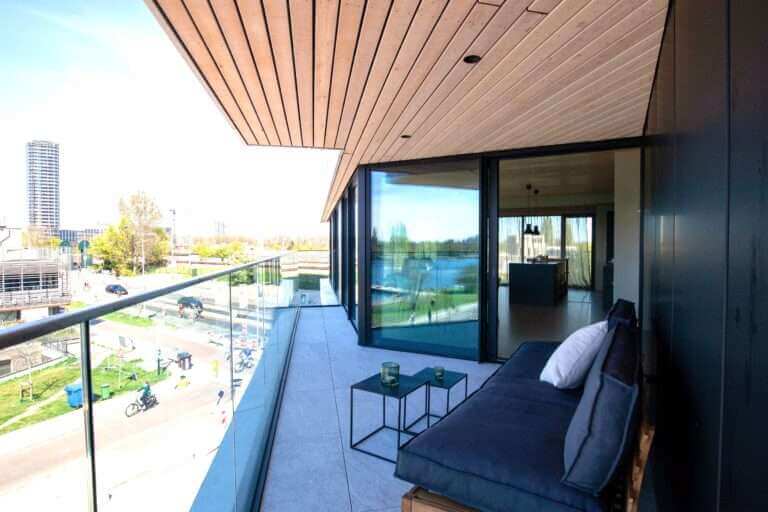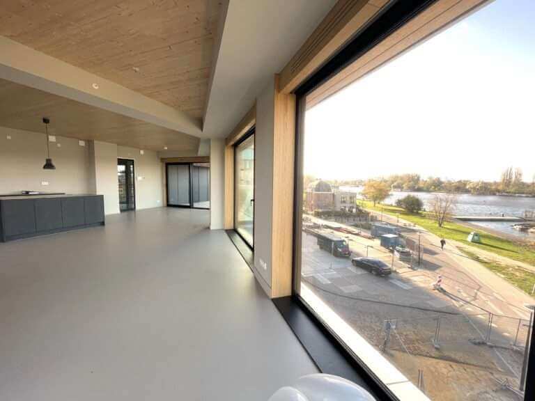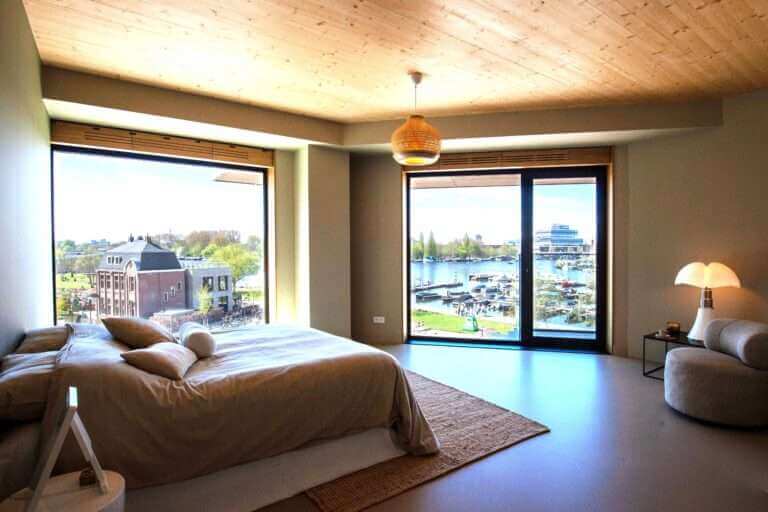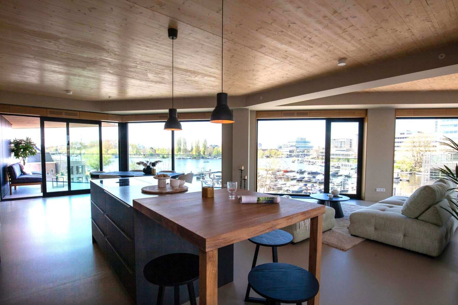 Puur woongenot met panoramisch uitzicht over de Amstel vanuit de Royale living en master bedroom.