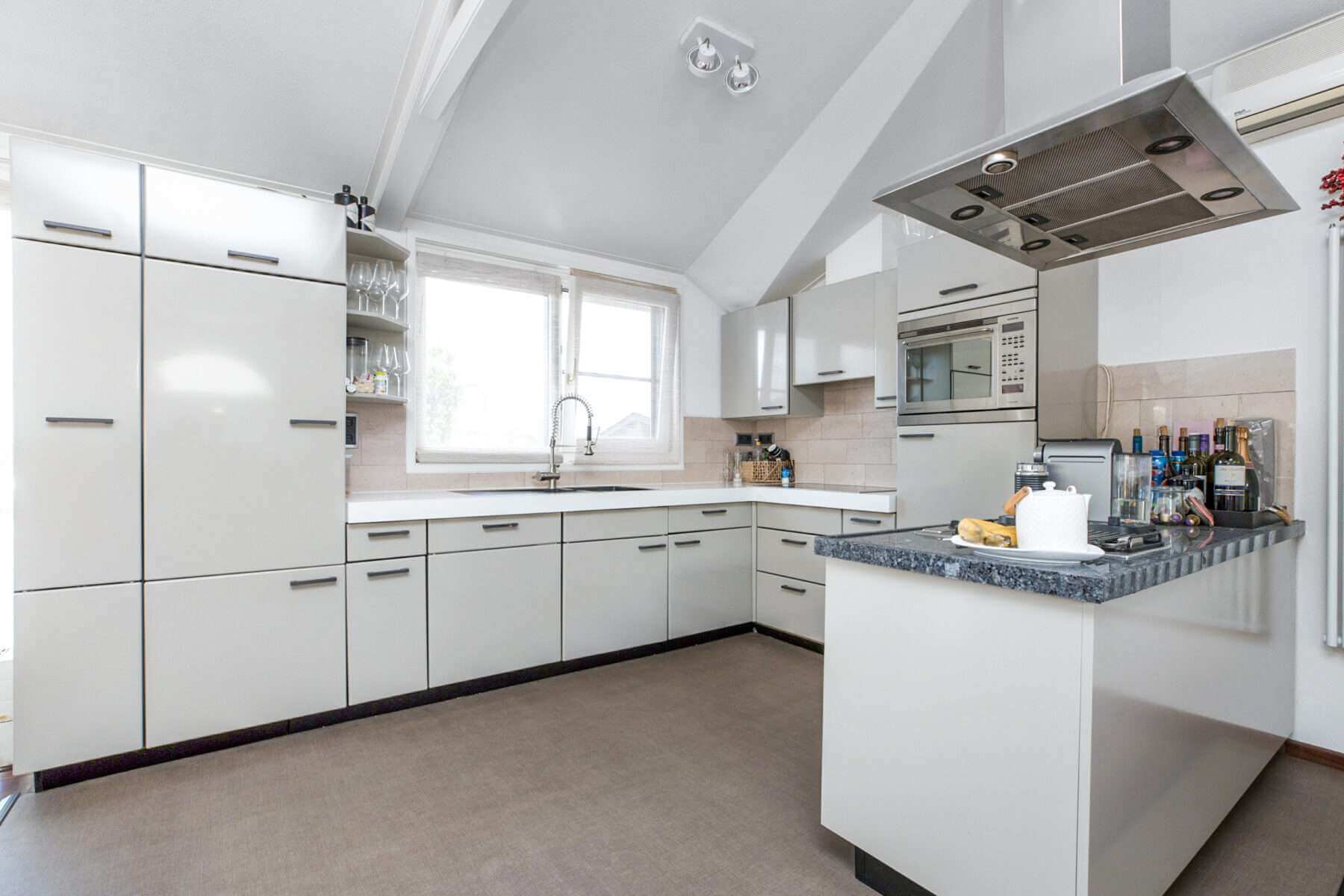 Open leef-keuken en bijkeuken. In de bijkeuken staan de extra Amerikaanse koelkast, wasmachine en droger.