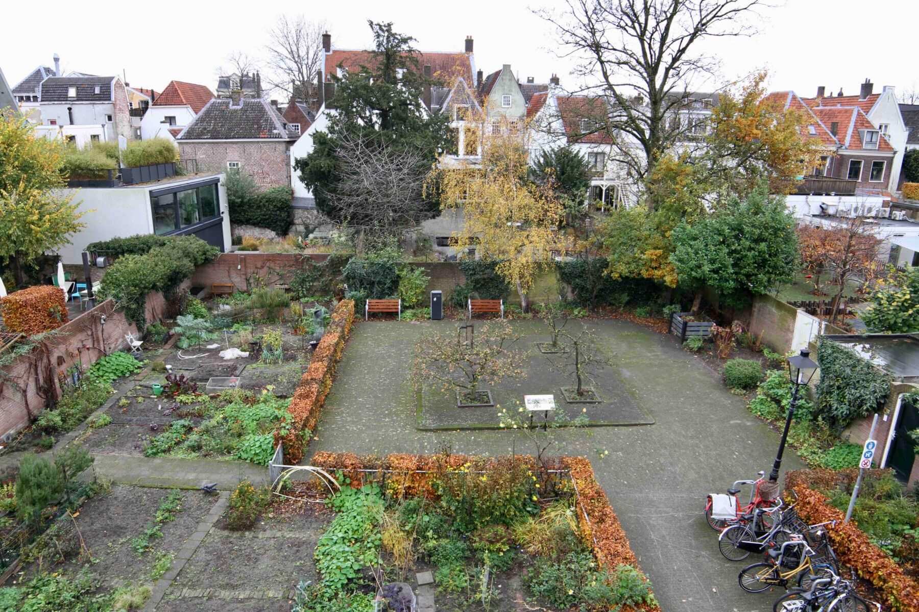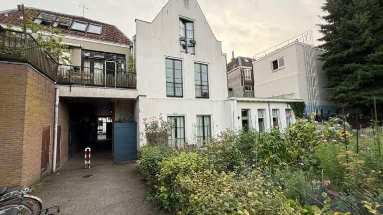 De woonkamer kijkt uit op de gezamenlijk achtertuin welke via de poort aan de zijkant bereikbaar is. Hier bevindt zich ook een gezamenlijk berging.