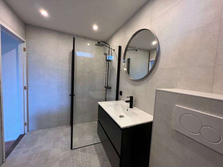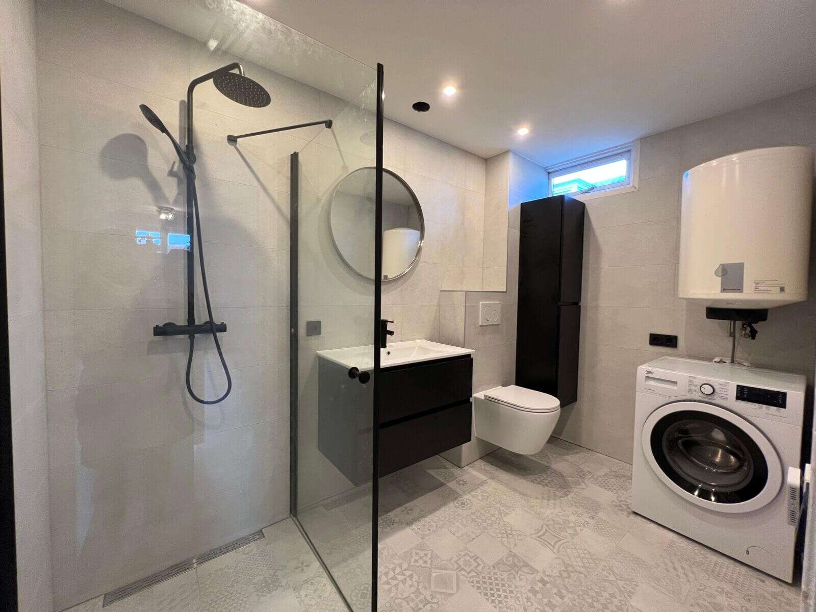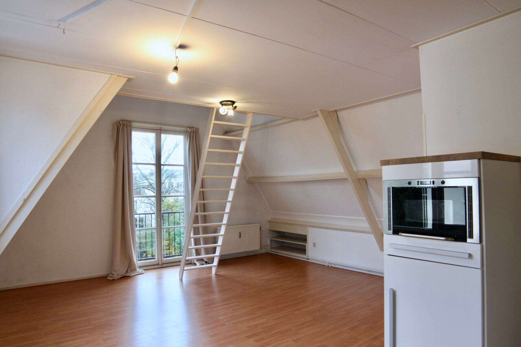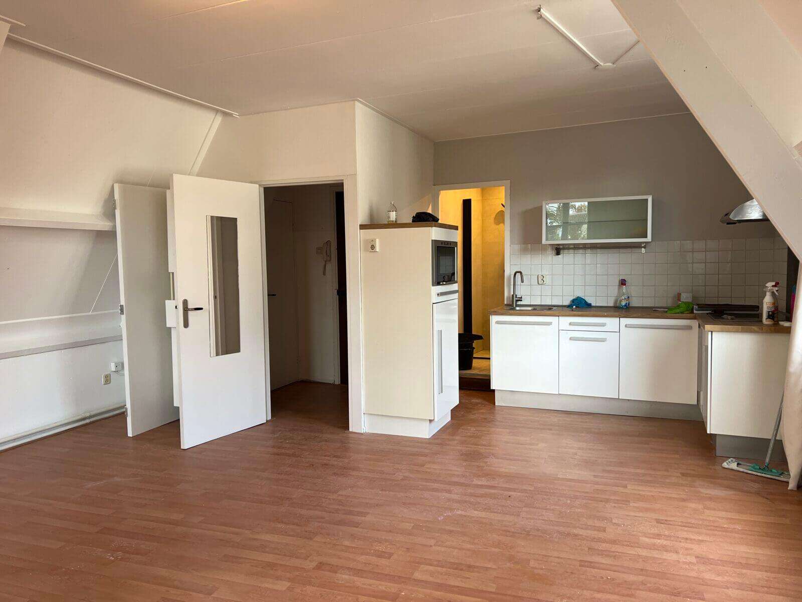 Entree in klein halletje met kapstok en meterkast en deur naar de woonkamer met veel lichtinval. De woonkamer heeft een open keuken met koelkast, magnetron, keramische kookplaat en de afzuigkap. Via de keuken bereik je de onlangs geheel gerenoveerde en moderne badkamer met (stort)douche, toilet en wastafelmeubel. Tevens staat hier de wasmachine (van het huis) en daar boven de warm water boiler.