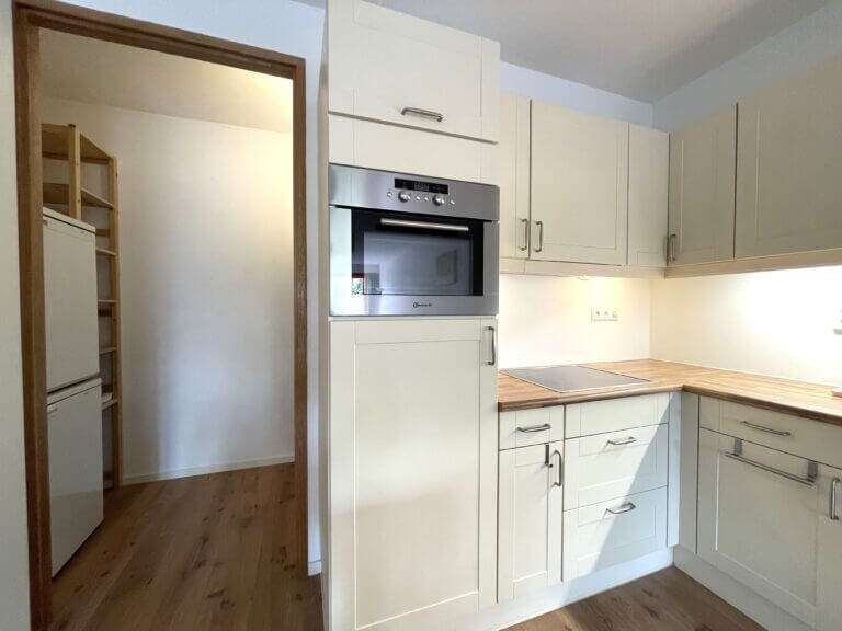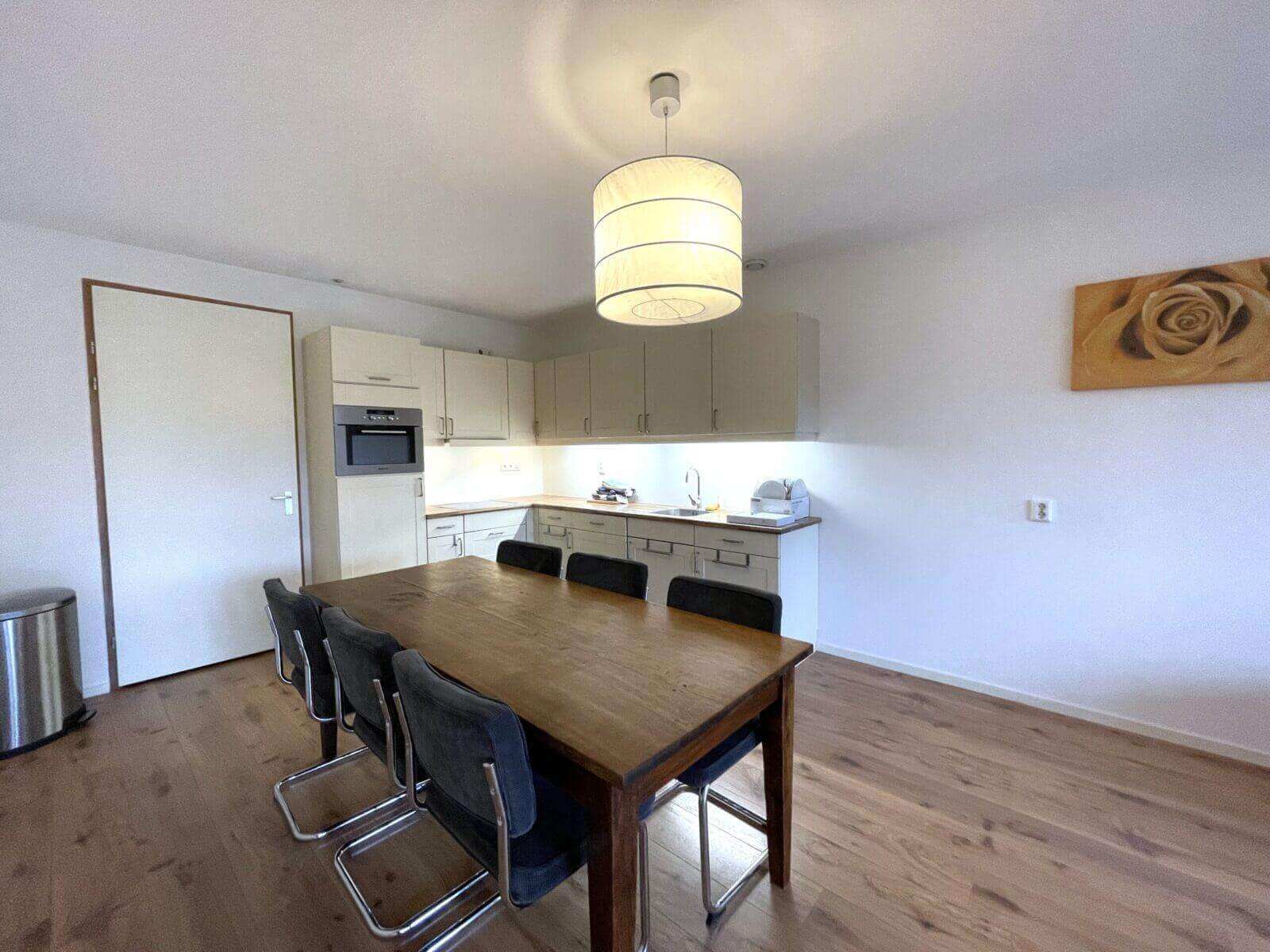 De aangrenzende open keuken is van alle gemakken voorzien. Denk aan; inductie kookplaat met afzuigkap, combioven, vaatwasser en een dubbele koelkast met vriezer. Naast de keuken bevindt zich nog een interne berging.