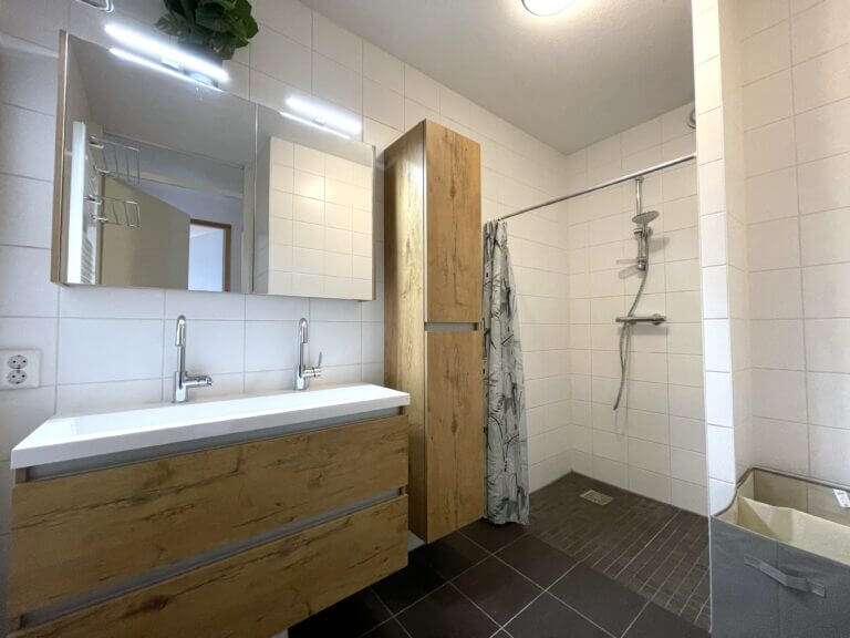 De badkamer beschikt over een ruime inloopdouche en dubbele wastafel.