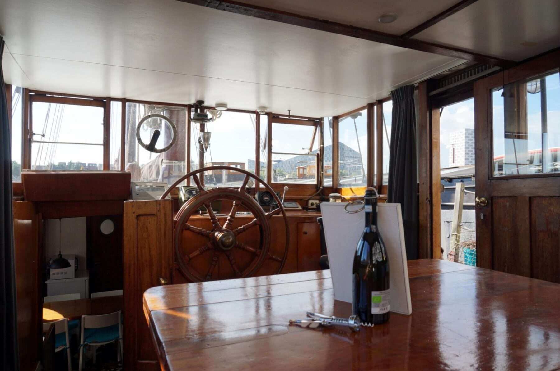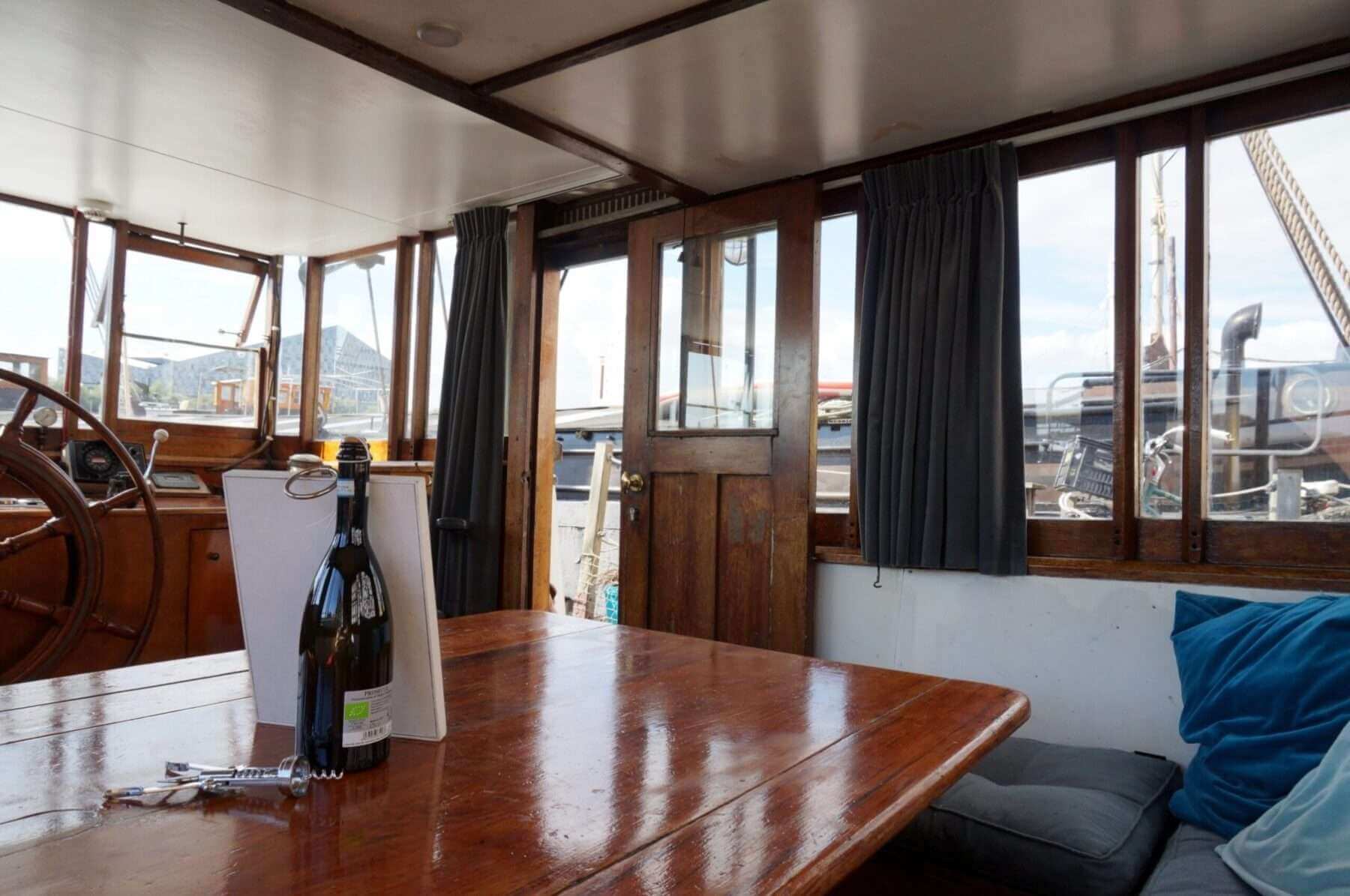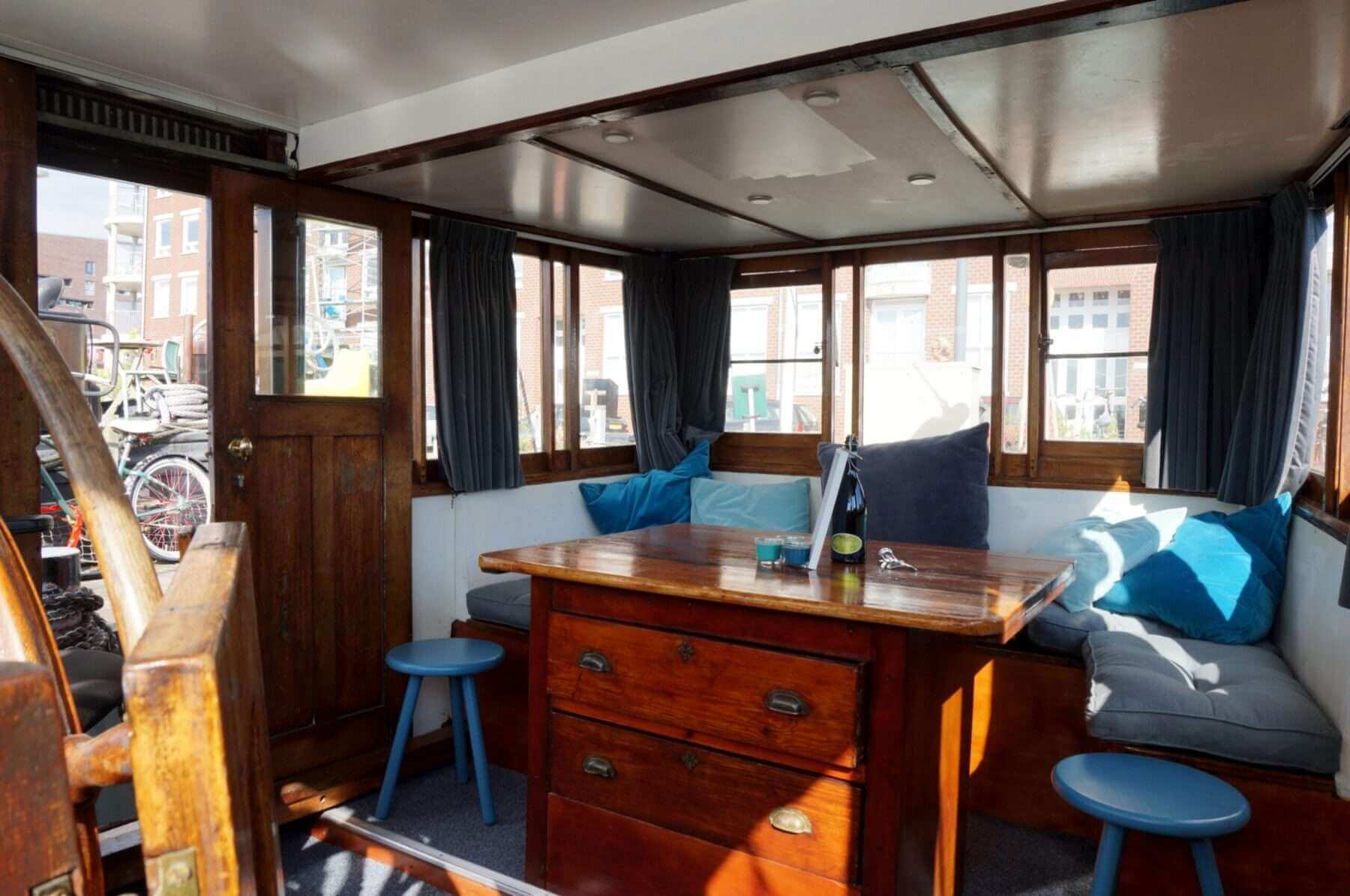 – Stuurhuis met een grote tafel voor 8 personen. Vanaf hier heb je uitzicht over de rustige straat, de buitenkant van het schip met zijn brede dek, de masten en zeilen en het water