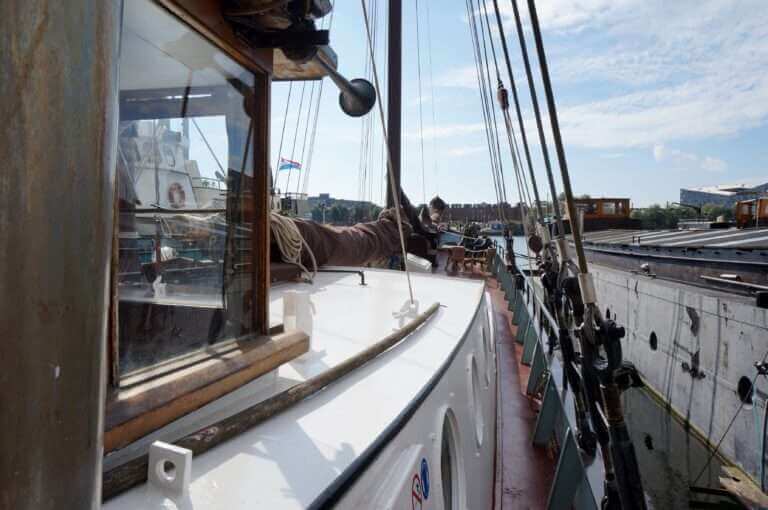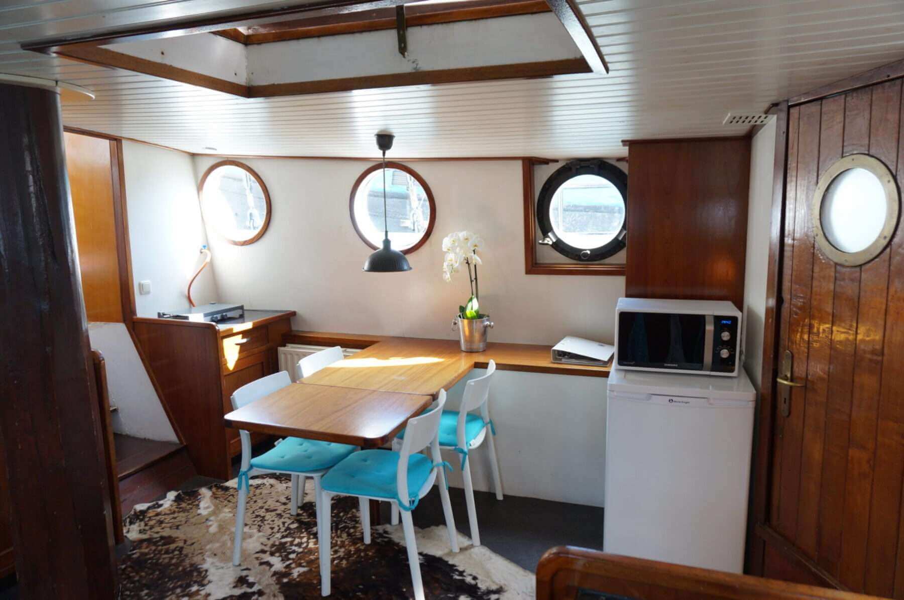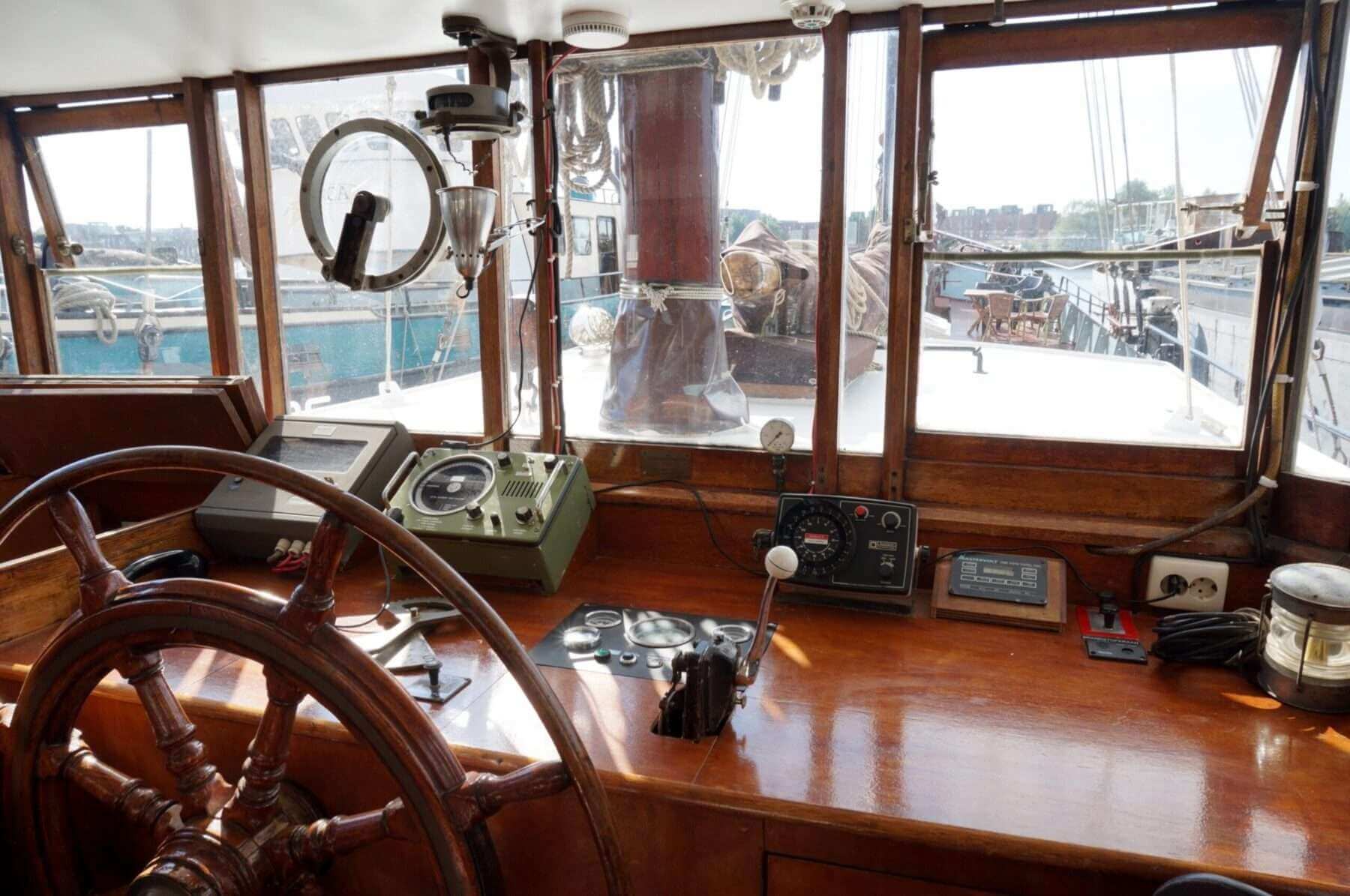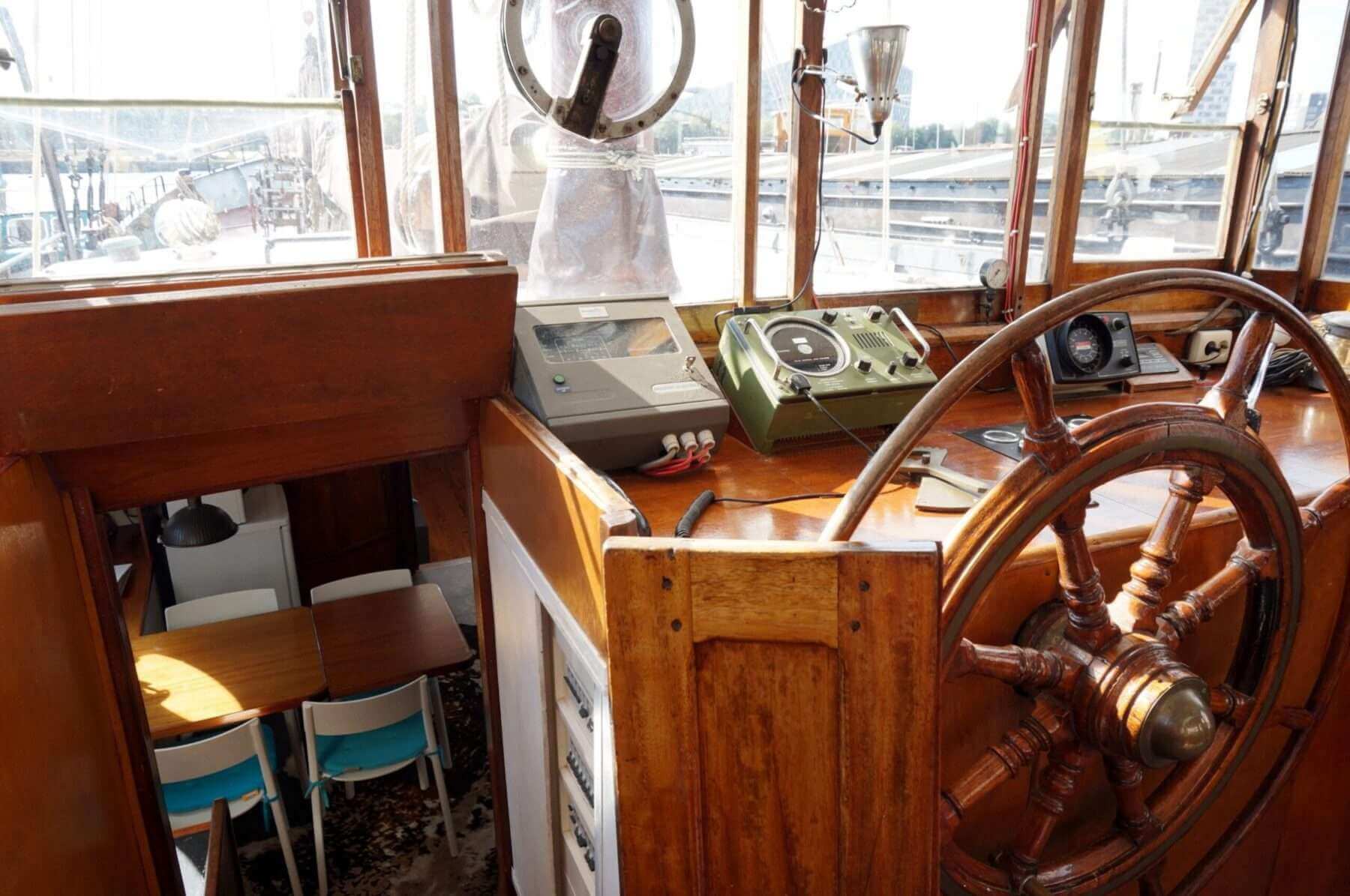 – Stuurhuis met een grote tafel voor 8 personen. Vanaf hier heb je uitzicht over de rustige straat, de buitenkant van het schip met zijn brede dek, de masten en zeilen en het water
