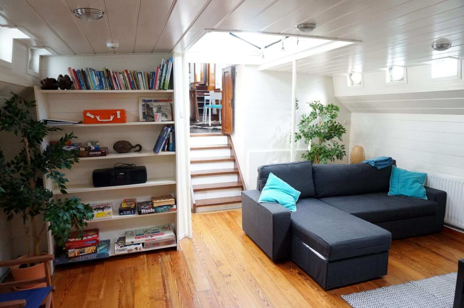 – Vier stappen naar beneden bevindt zich de ruime woonkamer, met twee banken, die tot comfortabele bedden kunnen worden veranderd