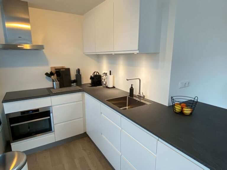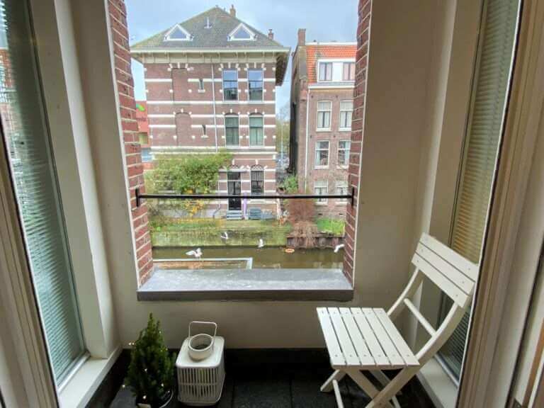 De woning beschikt over een volledig nieuwe keuken, nieuwe meubilering, nieuw bed en biedt een klein balkon met uitzicht op de gracht,