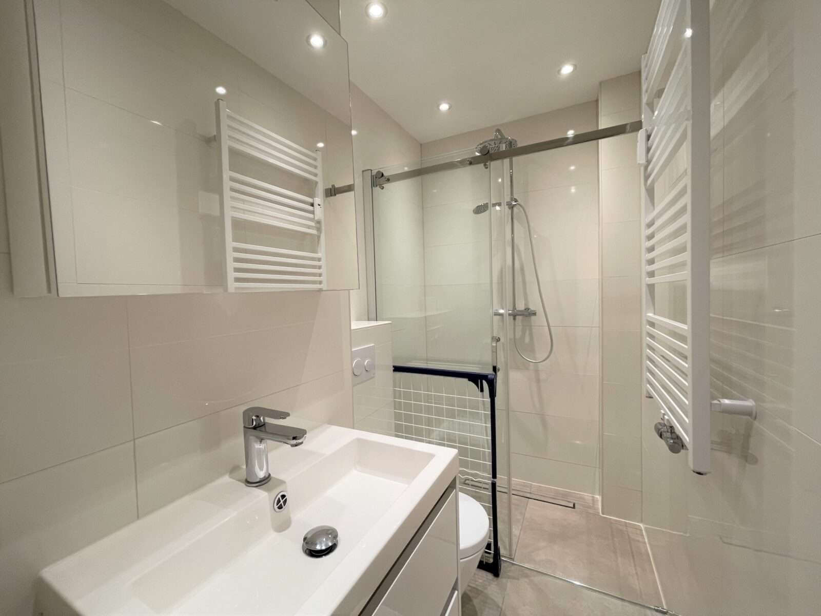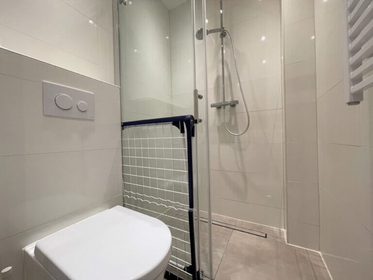 De woning heeft een moderne badkamer met toilet, wastafelmeubel en een inloopdouche.