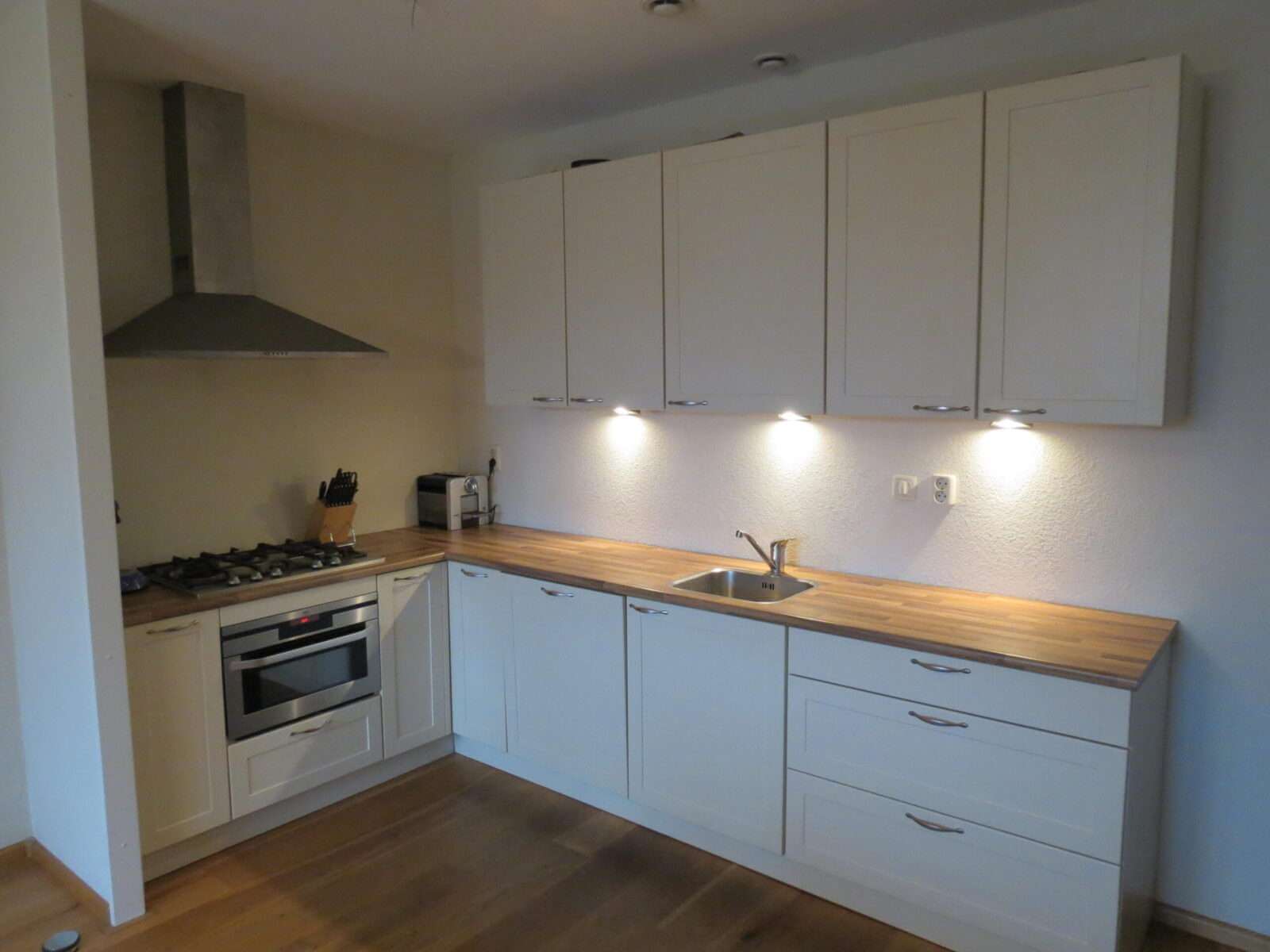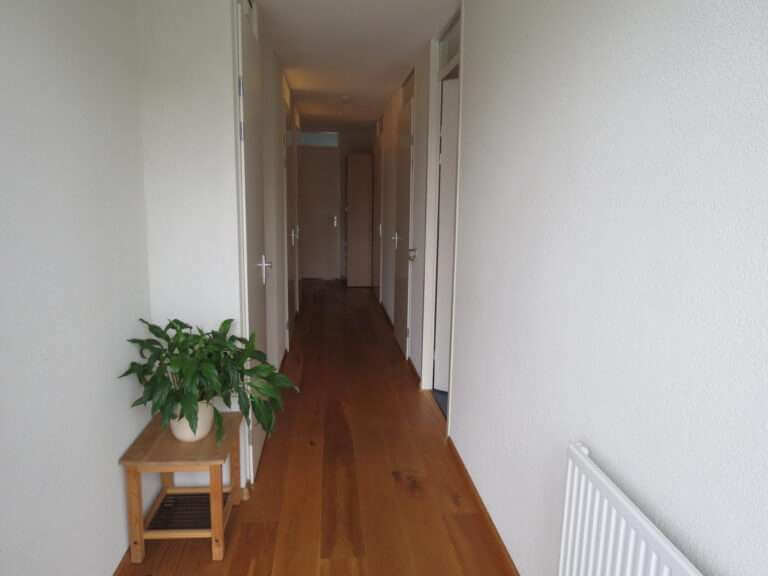 De vloer in de hal en woonkamer/keuken is voorzien van hout. De slaapkamers zijn voorzien van vloerbedekking.