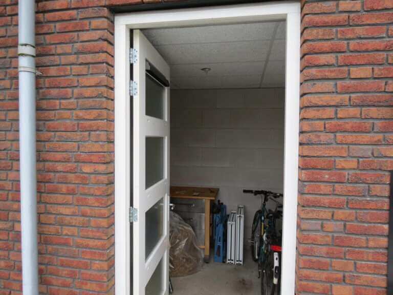 Berging. Entree, lange gang met toegang tot de meterkast, toilet met fonteintje, slaapkamer aan de voorzijde, tweede berging, washok voorzien van C.V.-ketel, wasmachine en droger, badkamer voorzien van bad, douche en wastafel, master bedroom aan de achterzijde met toegang tot de achtertuin en de woonkamer met openslaande deuren naar de tuin. De open keuken is voorzien van een 5-pits gaskookplaat, afzuigkap, koel/vriescombinatie, vaatwasser en combimagnetron.