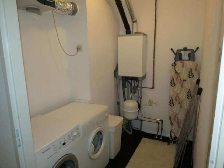 Berging. Entree, lange gang met toegang tot de meterkast, toilet met fonteintje, slaapkamer aan de voorzijde, tweede berging, washok voorzien van C.V.-ketel, wasmachine en droger, badkamer voorzien van bad, douche en wastafel, master bedroom aan de achterzijde met toegang tot de achtertuin en de woonkamer met openslaande deuren naar de tuin. De open keuken is voorzien van een 5-pits gaskookplaat, afzuigkap, koel/vriescombinatie, vaatwasser en combimagnetron.