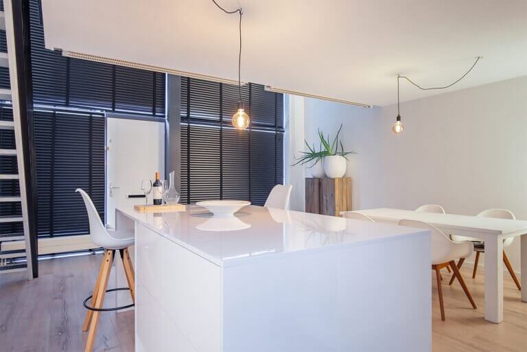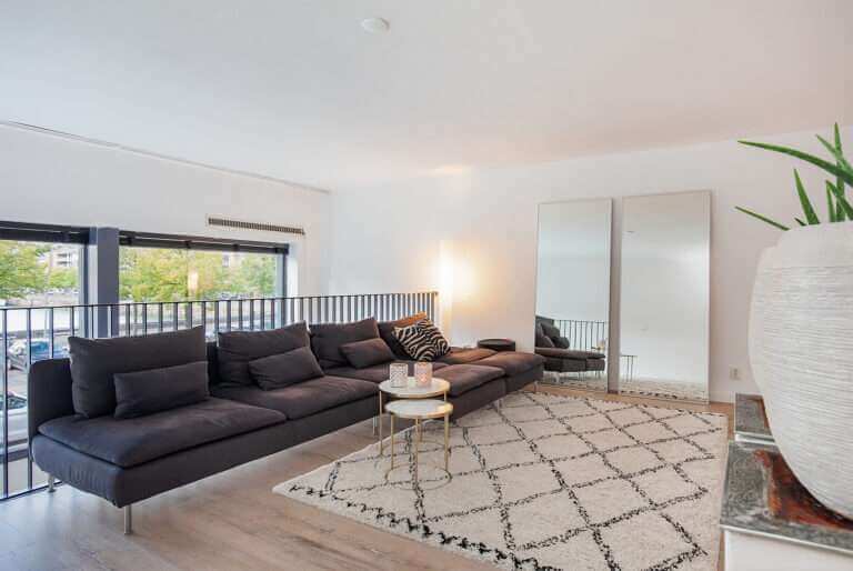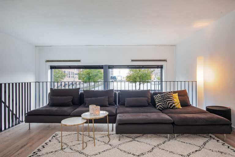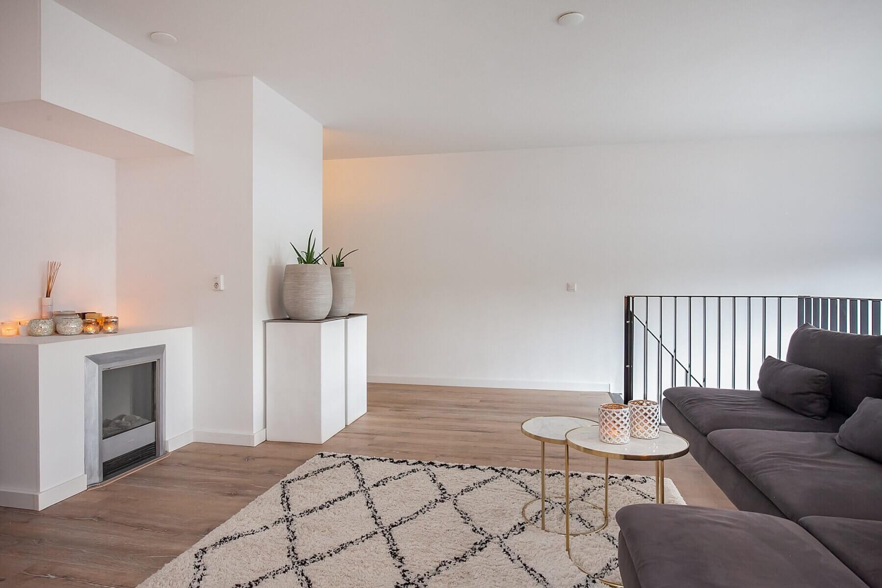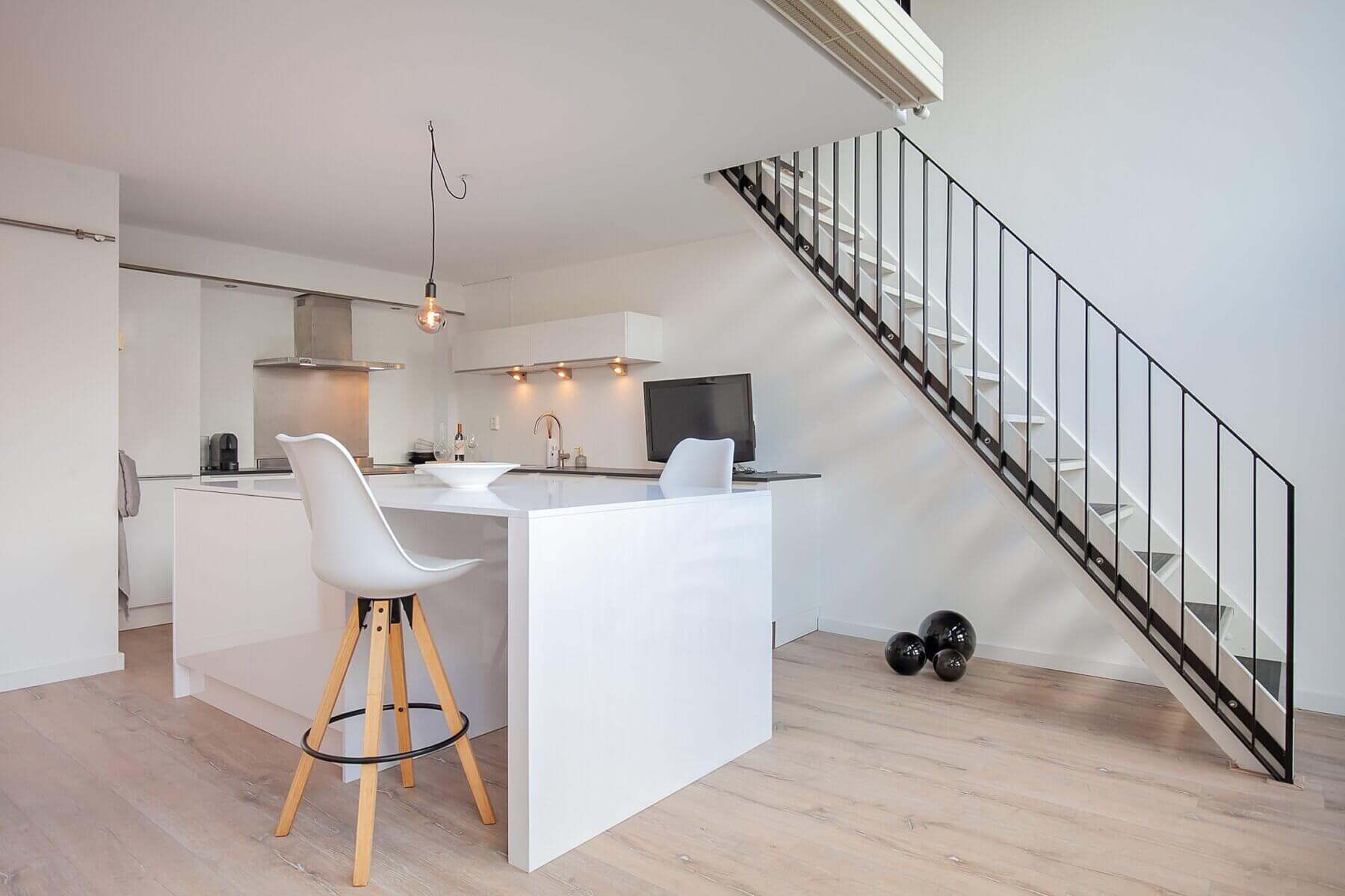 Vanuit de woonkeuken loopt u de trap op naar het lounge gedeelte op de 1e verdieping. Het lounge gedeelte staat door middel van een vide in open verbinding met de eronder gelegen woonkeuken.