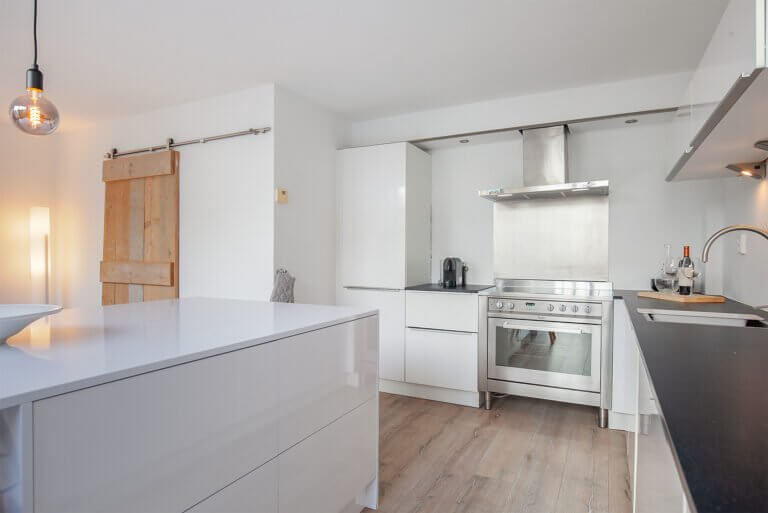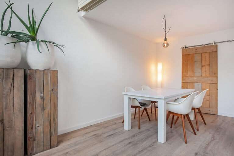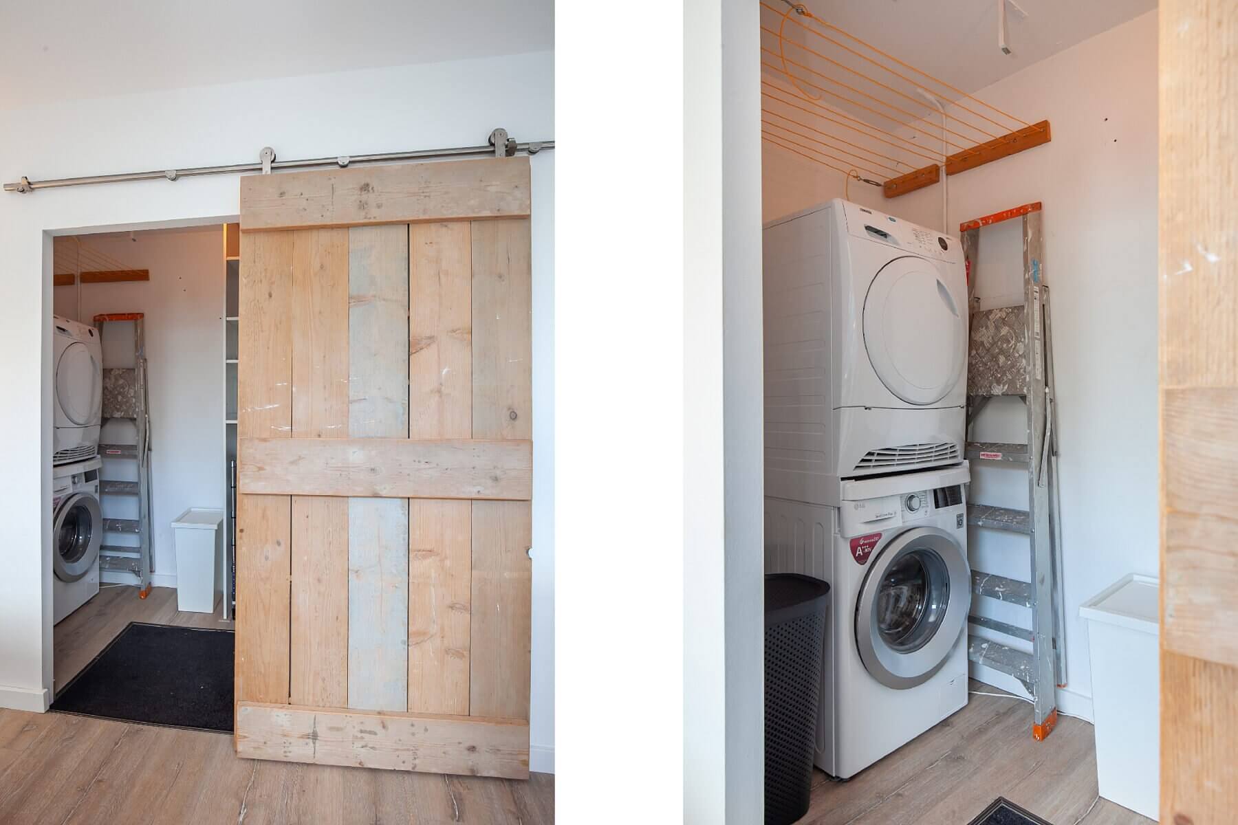 Achterin de woonkeuken biedt een stoere houten schuifdeur toegang tot een praktische wasruimte annex provisieruimte met wasmachineaansluiting van ± 5 m². Genoeg opbergruimte dus.