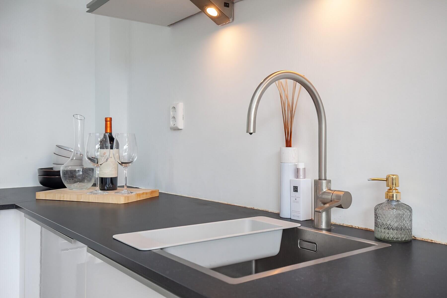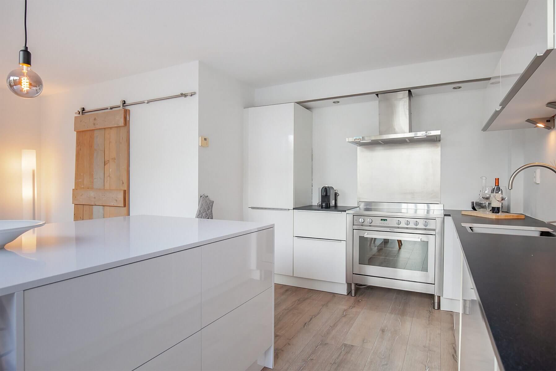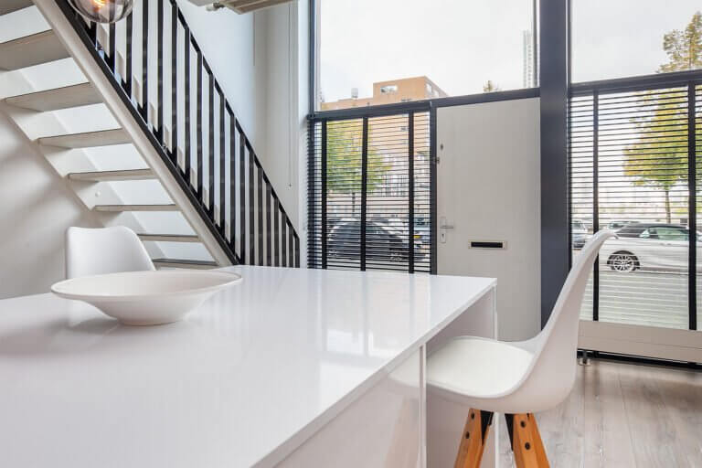 Kom binnen in deze unieke woning! Door de enorme raampartijen vanaf de vloer tot het plafond én de vide is de gehele woning heerlijk verlicht met daglicht. Momenteel wordt de benedenverdieping gebruikt als woonkeuken, maar u kunt vanuit deze ruimte uiteraard ook prima werken. Deze fantastische woonkeuken is voorzien van diverse moderne inbouwapparatuur zoals een keramische kookplaat, RVS afzuigkap, oven, koel/vries combinatie, een vaatwasser en heel veel kastruimte.