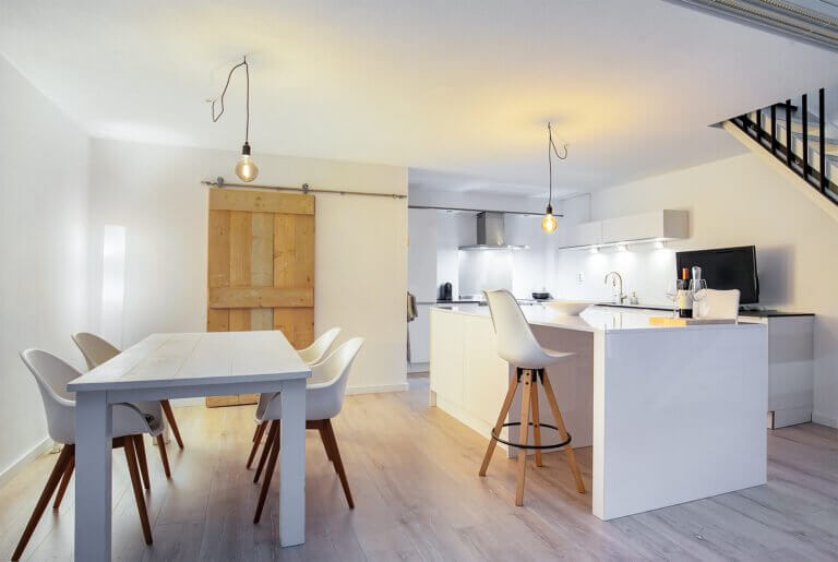 Ook de vloeren van het het loungegedeelte en de slaapkamers op de eerste verdieping zijn afgewerkt met een mooie eiken look laminaatvloer.