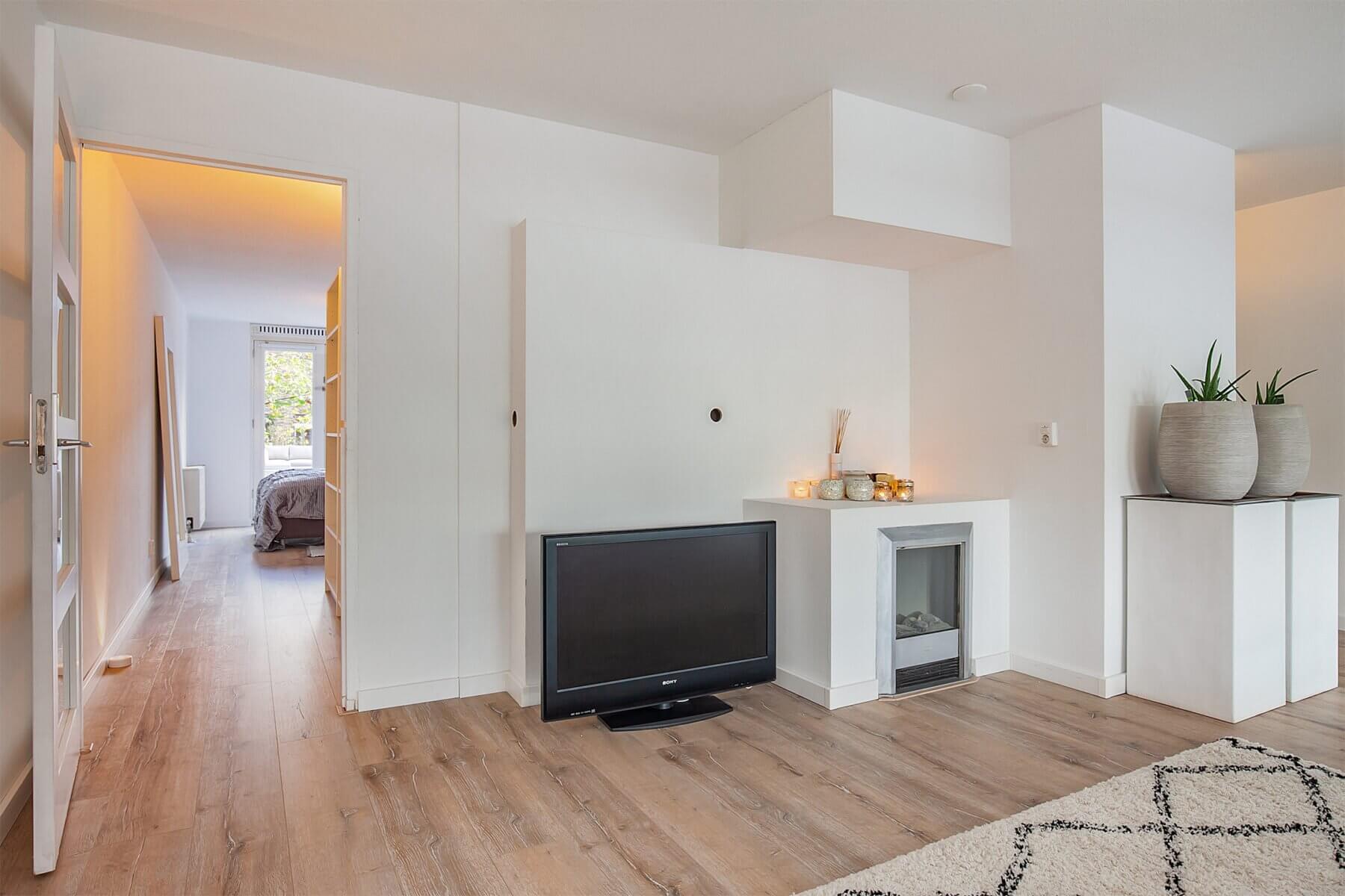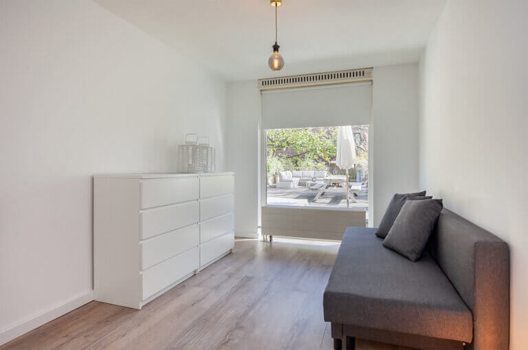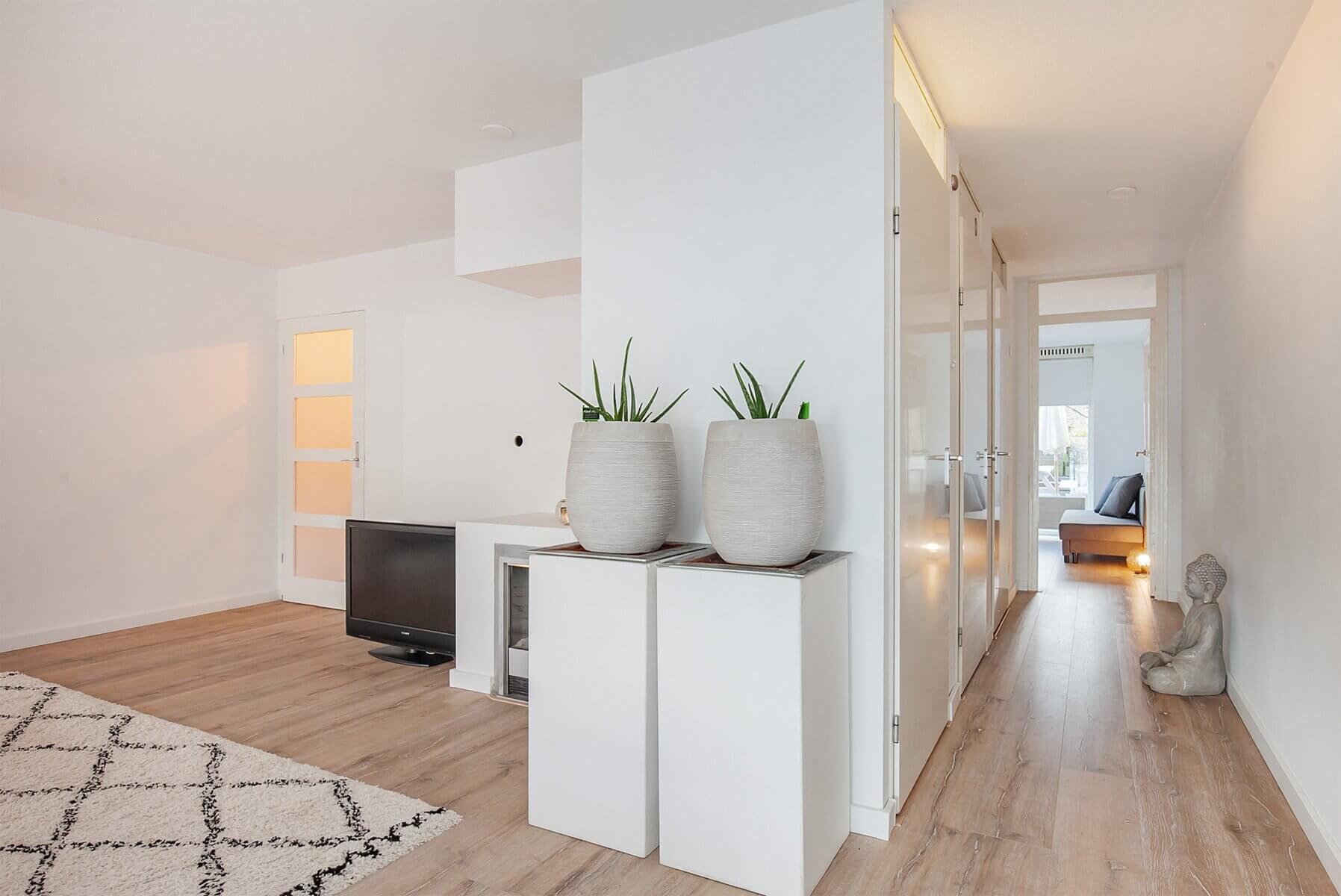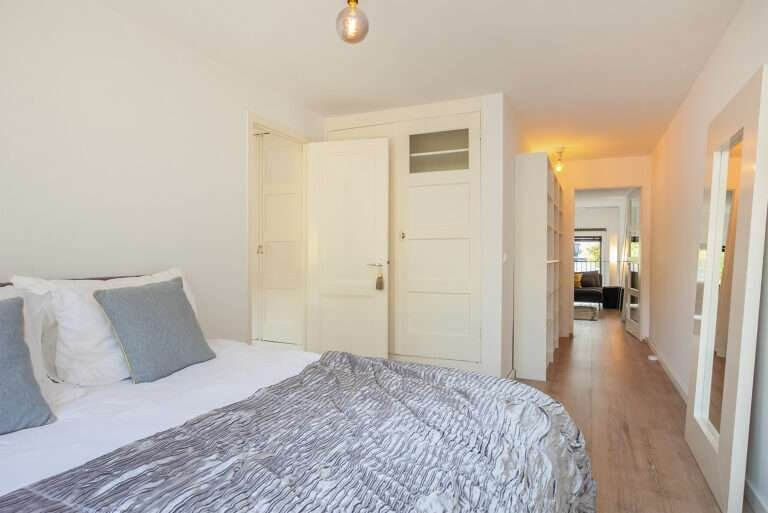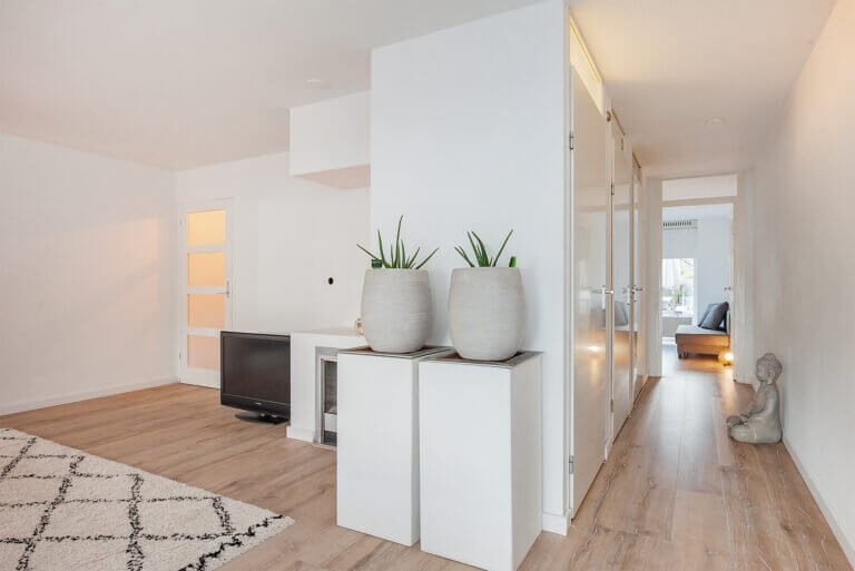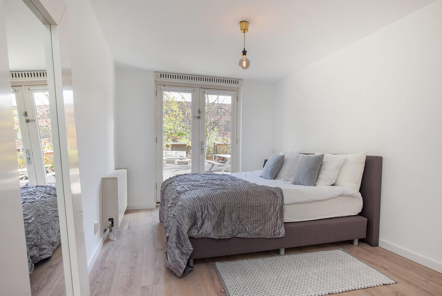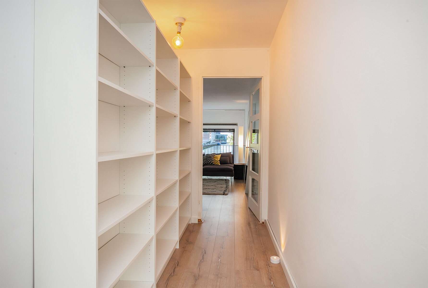 In het lounge gedeelte zit u ’s avonds heerlijk knus op de bank en kunt u genieten van een fantastisch uitzicht op de Spoorweghaven en stadsgezicht. Zowel aan de rechter als de linkerkant van deze ruimte bevindt zich achter mooie witte deuren een hal naar de twee slaapkamers van de woning. Op weg naar de 2e slaapkamer treft u in de rechter hal de toegang naar de moderne badkamer en het toilet. De badkamer is voorzien van een inloopdouche met regendouche, ligbad met douchefunctie, een enkele wastafel met ombouw en een design radiator.