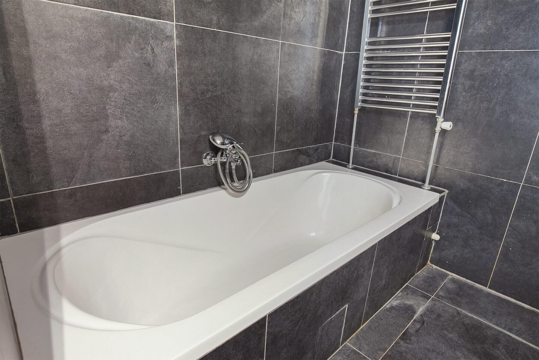 • Badkamer met inloopdouche, ligbad, vaste wastafel met ombouw en design radiator;