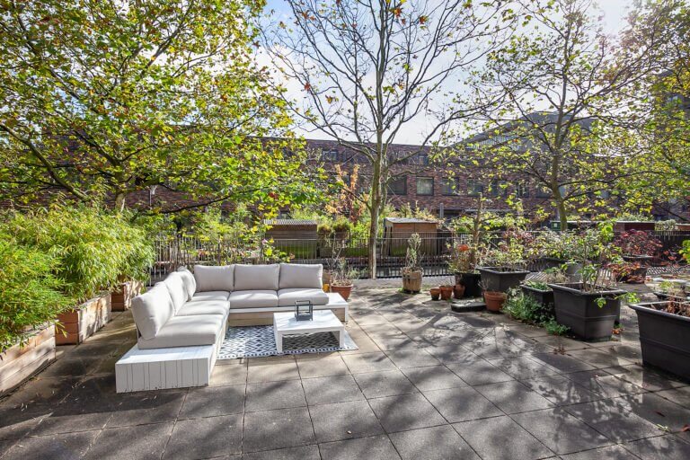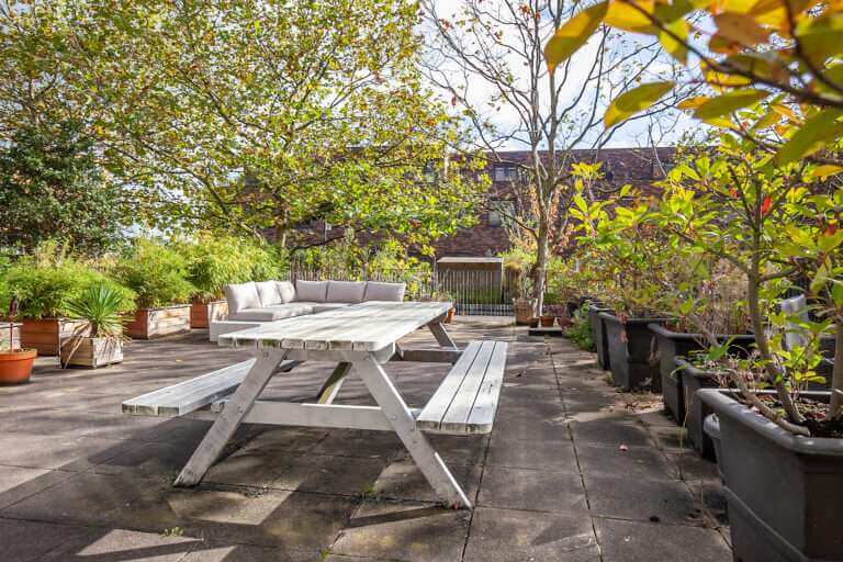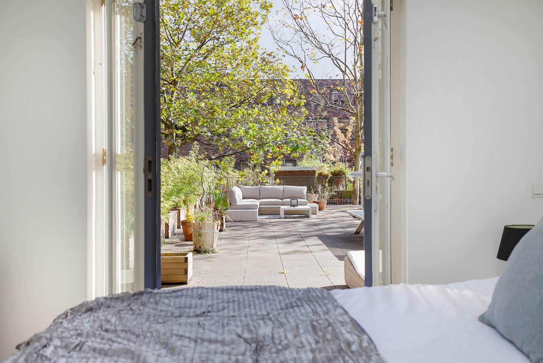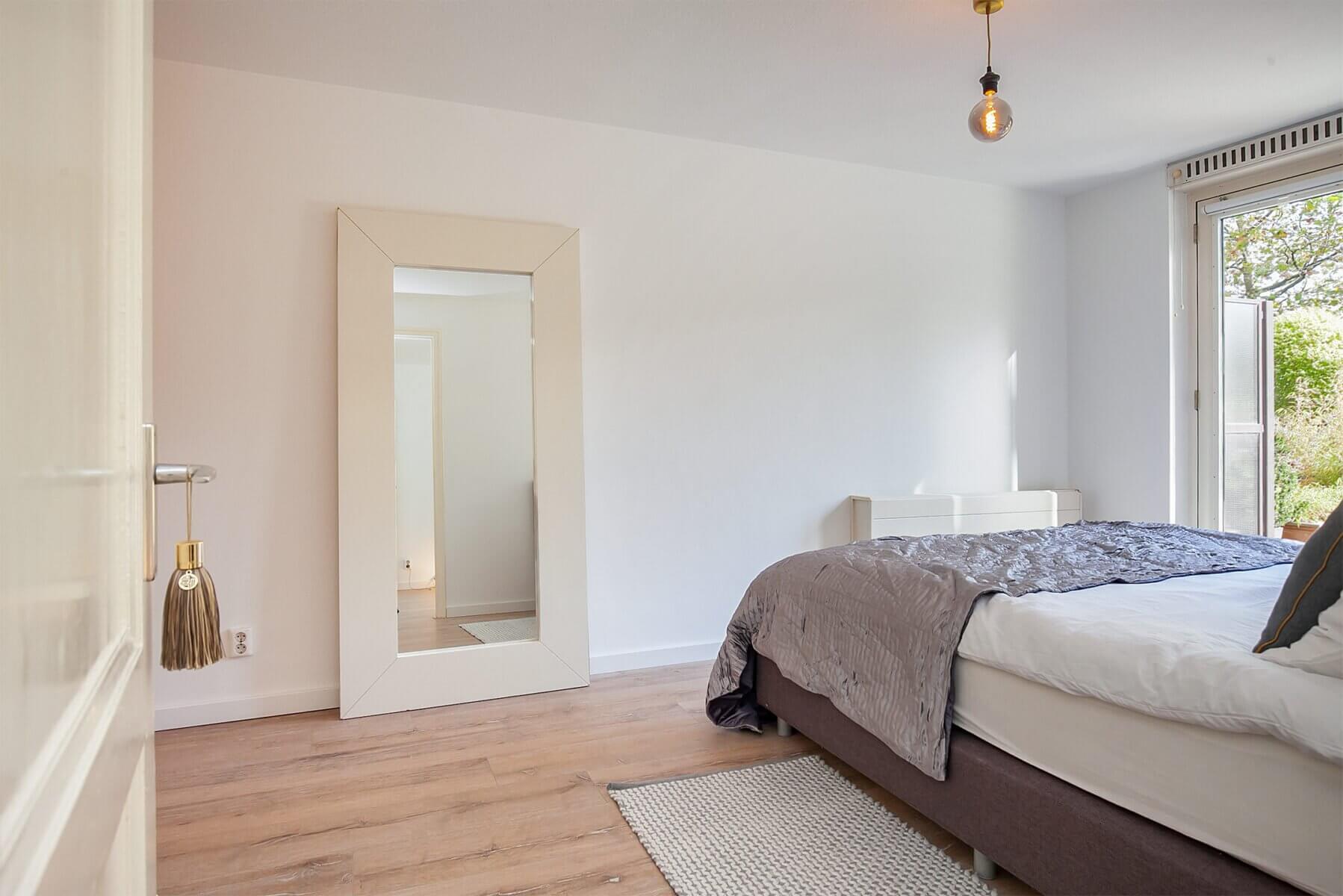 De linker hal biedt toegang aan de gezellige master bedroom met inbouwgarderobekasten. Via de master bedroom bereikt u via openslaande deuren de zonnige daktuin van maar liefst 90m2. De daktuin is gelegen op het zuidoosten en biedt via een trap toegang tot de aan de achterzijde van het gebouw gelegen parkeergarage.