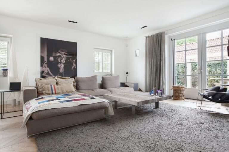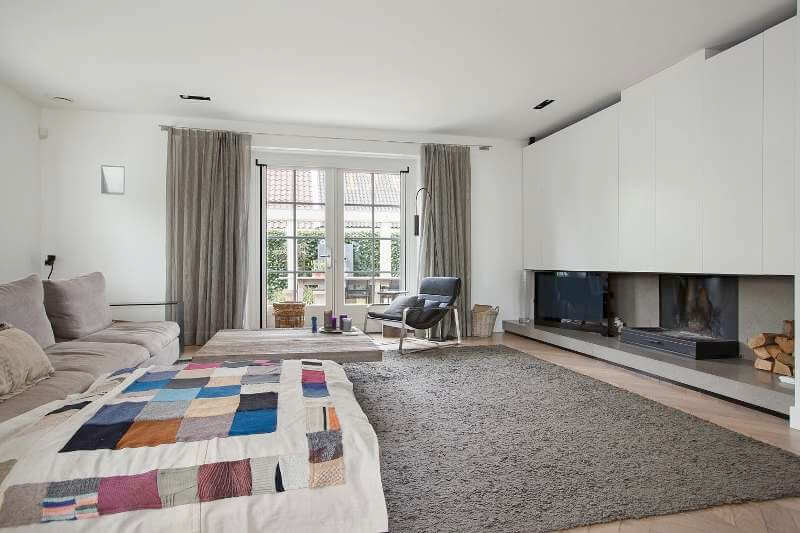 De woonkamer heeft een ingebouwde kastenwand met open haard en openslaande deuren naar het terras.
