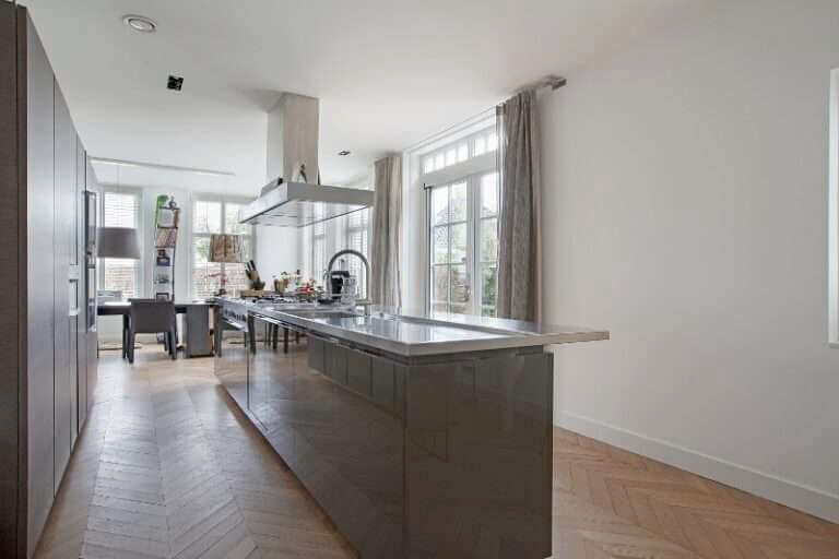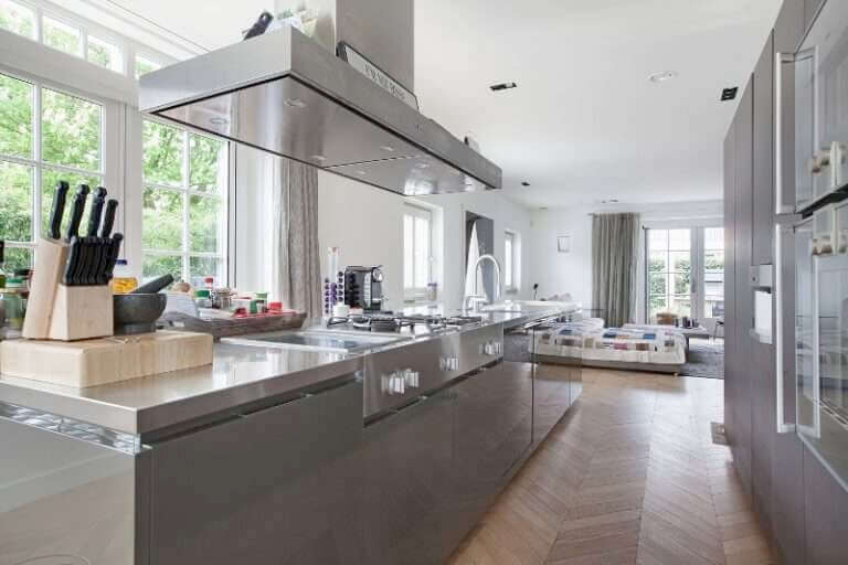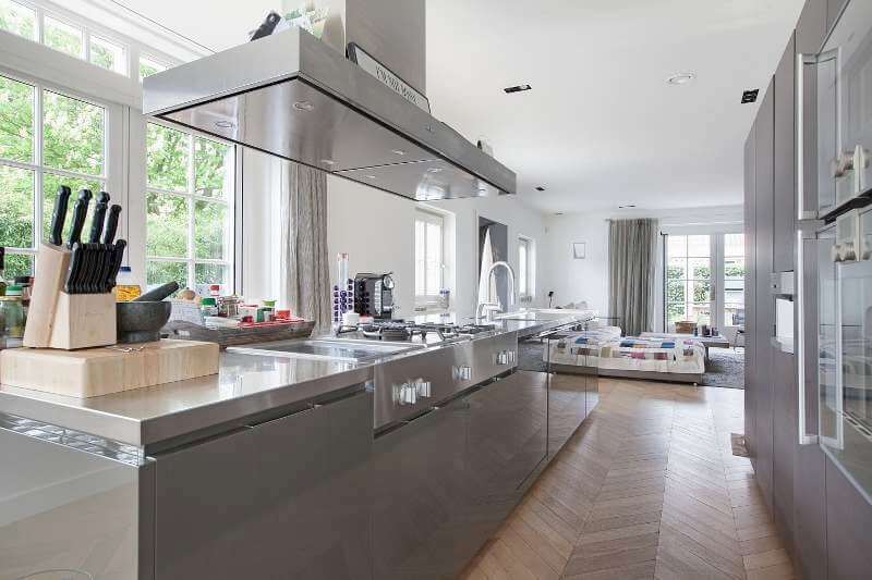 Een schitterende en volledig ingerichte open woonkeuken met keukeneiland in Gaggenau stijl. Door middel van openslaande deuren toegang naar de tuin.