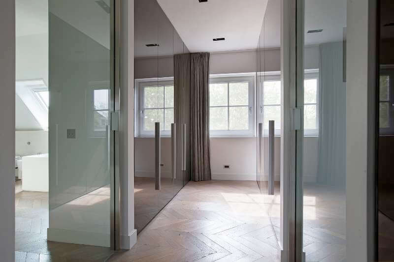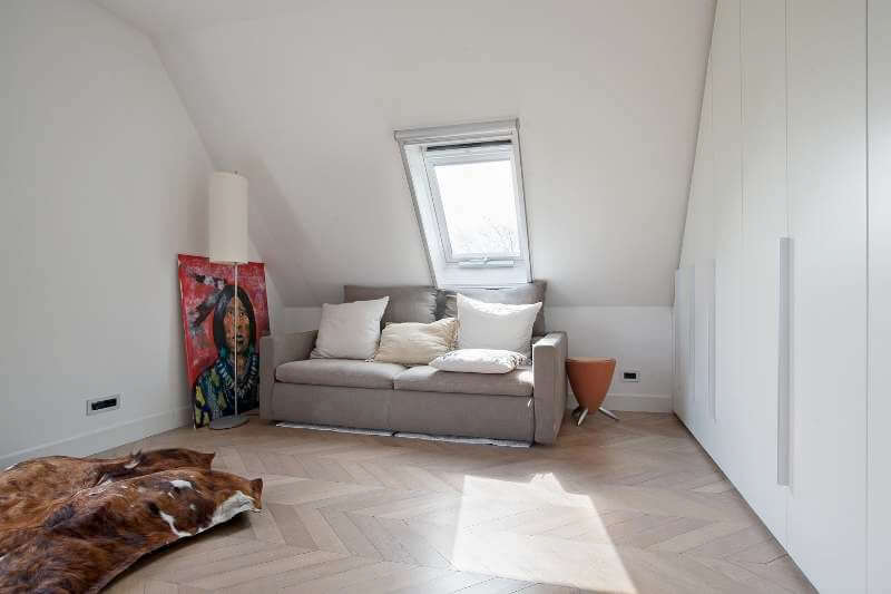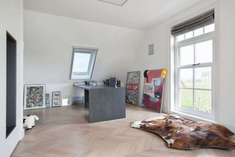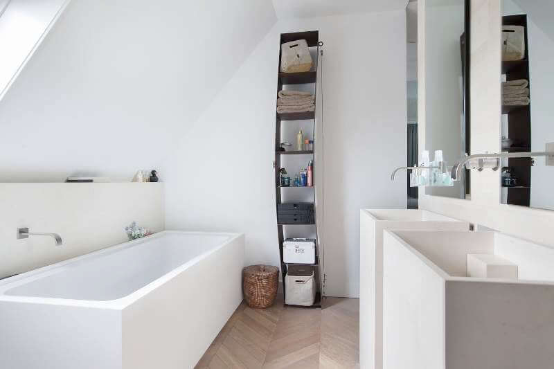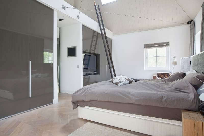 Via de “zwevende” open metalen trap bereikt u de verdieping met 2 grote slaapkamers en inloopkasten. Beide slaapkamers hebben ingebouwde kasten met een gashaard. De achter-slaapkamer heeft een vide met bibliotheek. In de ruimte (slaapkamer mogelijk) hiertussen is een kleedkamer met aan beide zijdes een kastenwand.