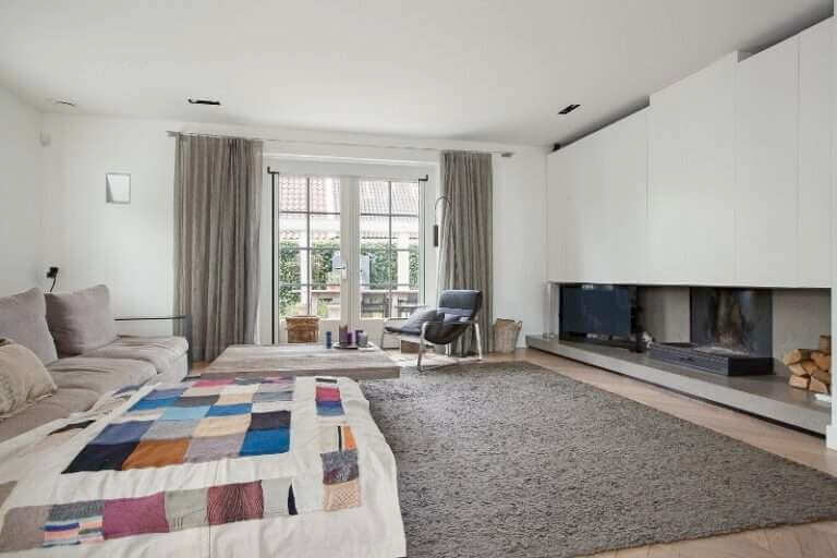 De woonkamer heeft een ingebouwde kastenwand met open haard en openslaande deuren naar het terras.