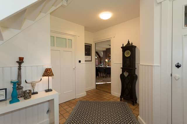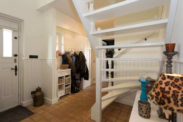 Entreehal open trap naar verdieping en toegang tot woonkamer, slaapkamer en badkamer. Vanuit de woonkamer toegang tot de open keuken. De woonkamer is voorzien van een openhaard en openslaande deuren naar de tuin. De open keuken is aan de voorzijde gelegen.