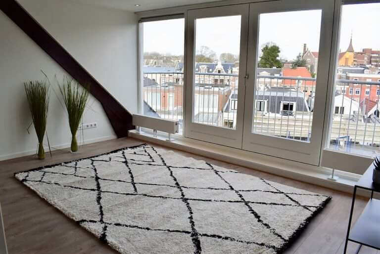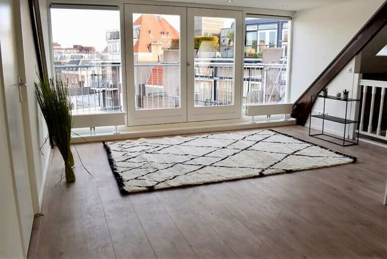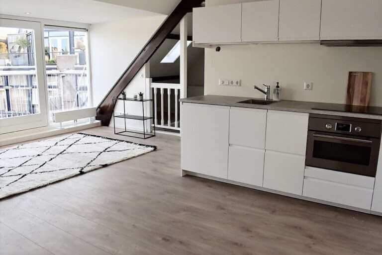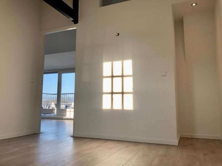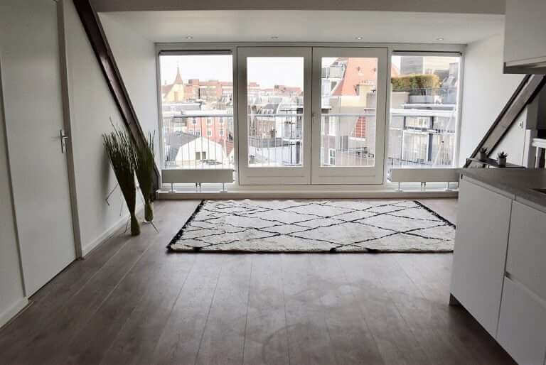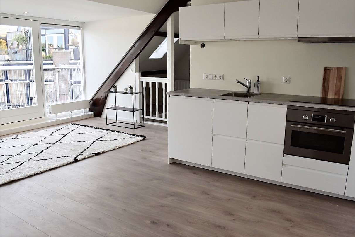 – Zeer lichte woonkamer met zeer grote schuifpui, Frans balkon met uitzicht op de Haarlemse daken;
