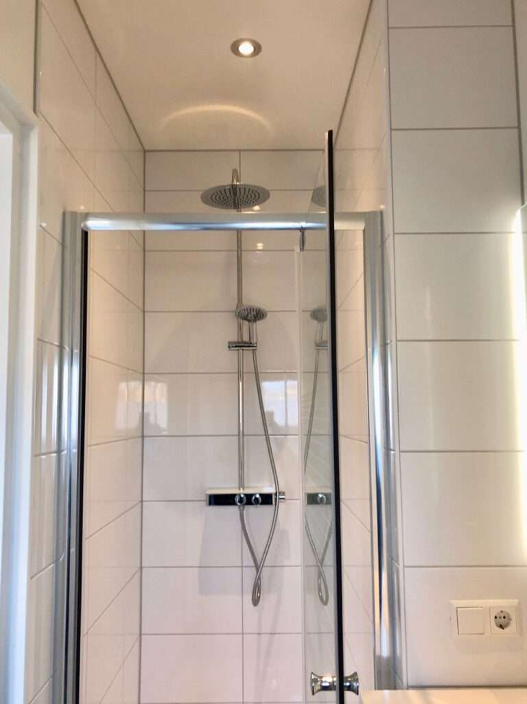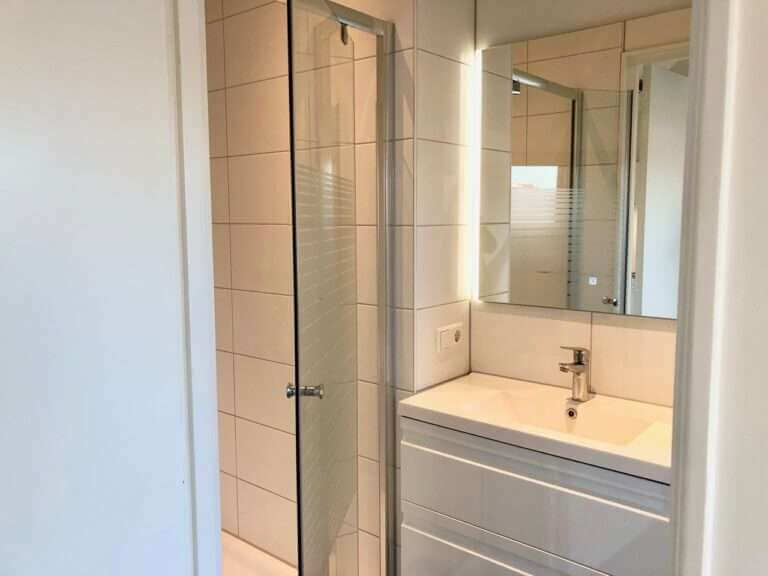 – Ruime badkamer met toilet en luxe douche, wastafelmeubel en aansluiting voor wasmachine en droger;