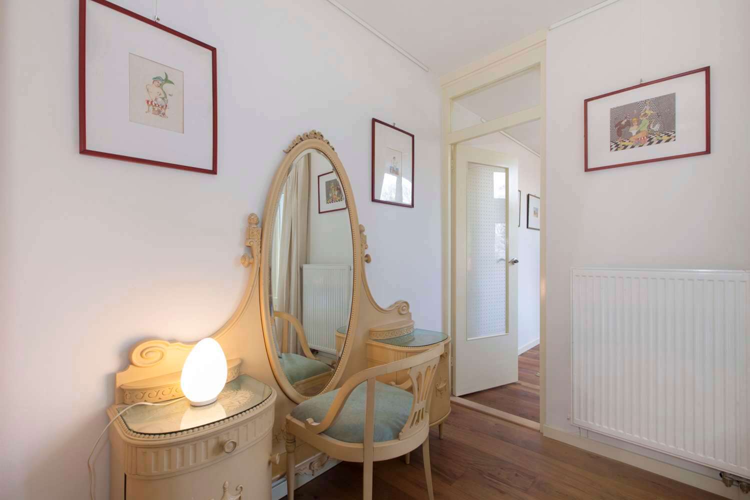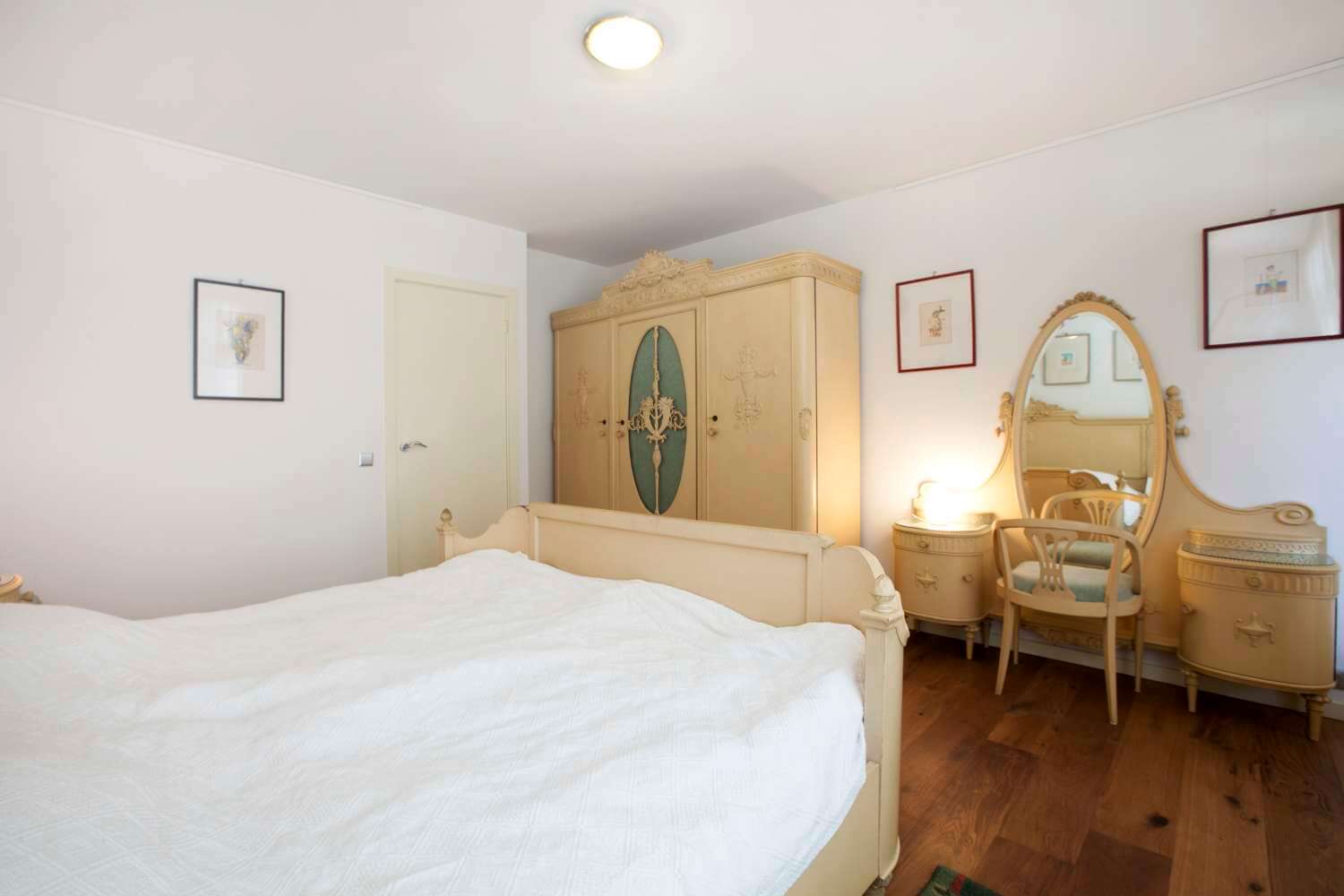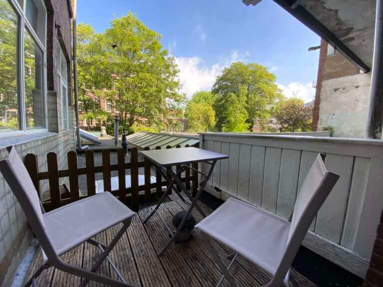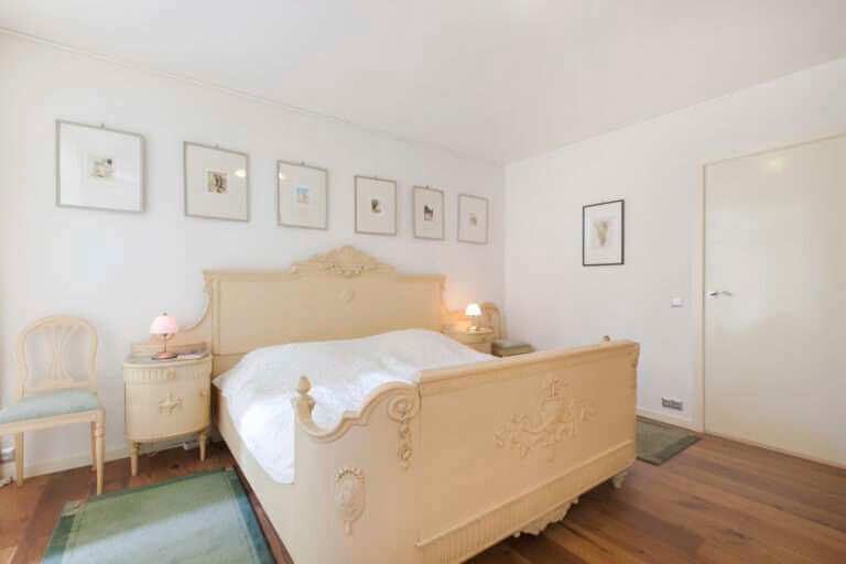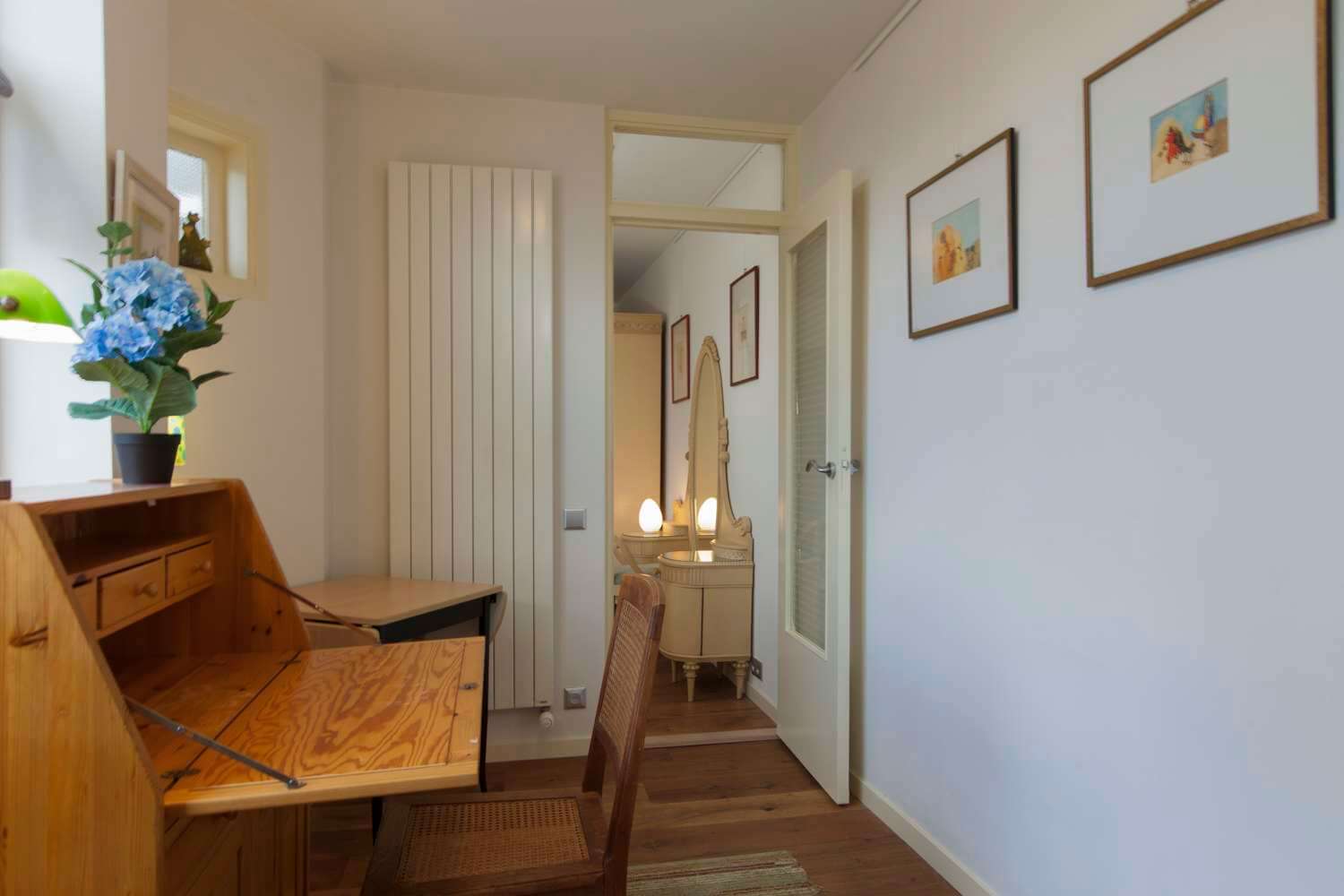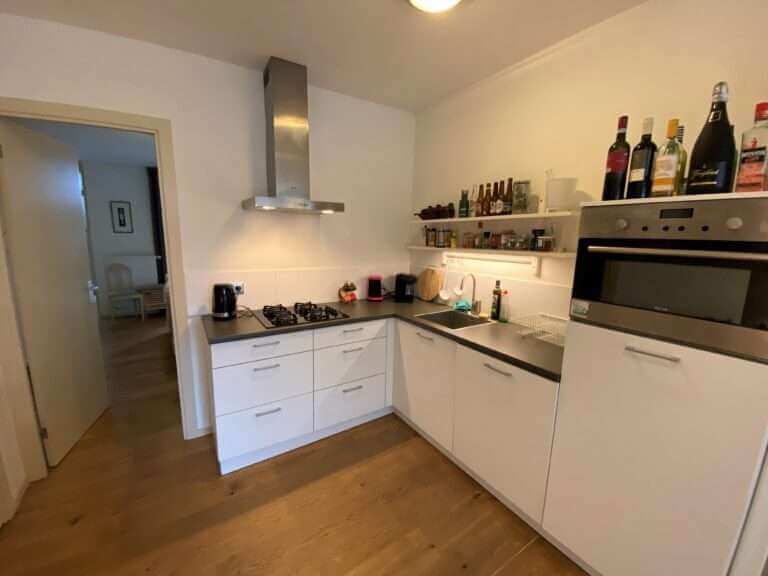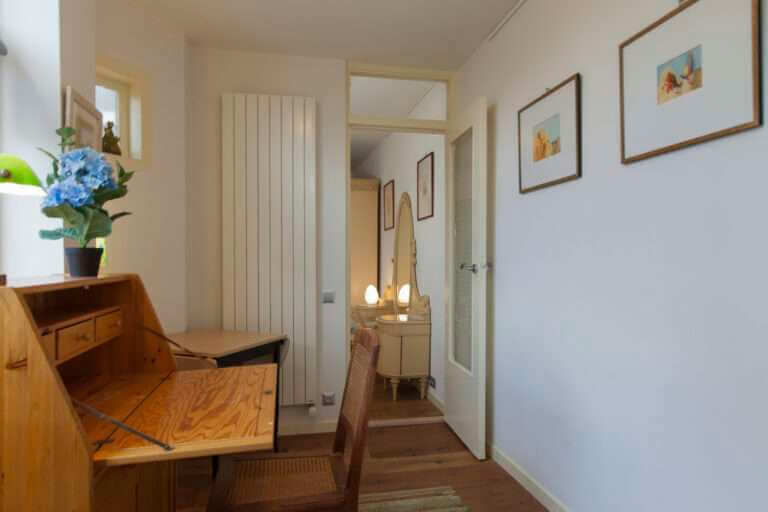 In de keuken bevindt zich een bergkast met daarin de wasmachine, en via de keuken bereik je de ruime slaapkamer met toegang tot het balkon. De tweede kamer is een tussenkamer tussen de slaapkamer en de badkamer, en is ingericht als studeerkamer.