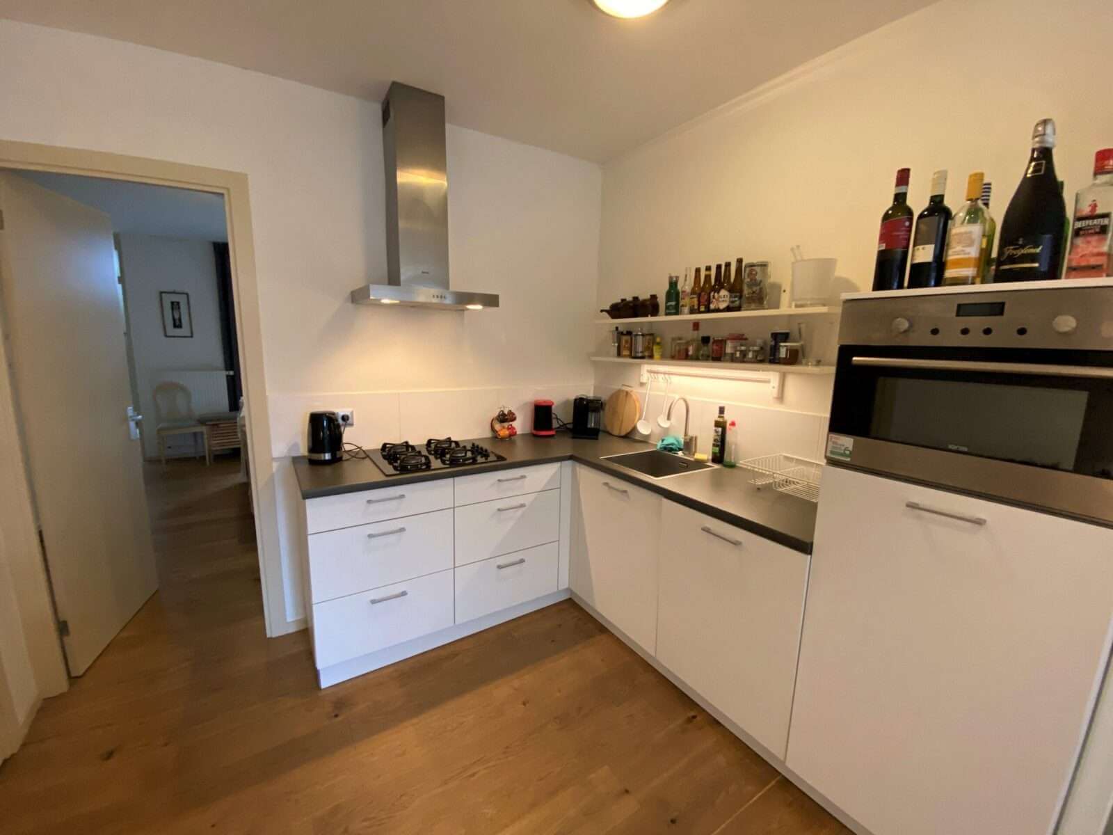 Via de hal betreed je de open keuken, voorzien van diverse inbouwapparatuur zoals een koel-vriescombinatie, een 4-pits gasfornuis, en een inbouw combi-magnetron.