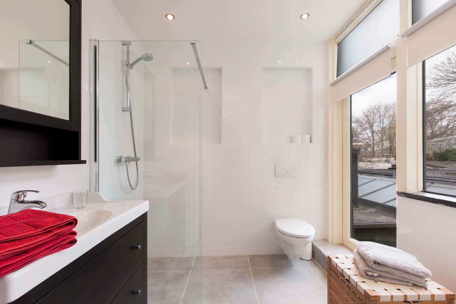 De recent gerenoveerde badkamer met raampartij is voorzien van een ruime inloopdouche, een toilet en een badkamermeubel.