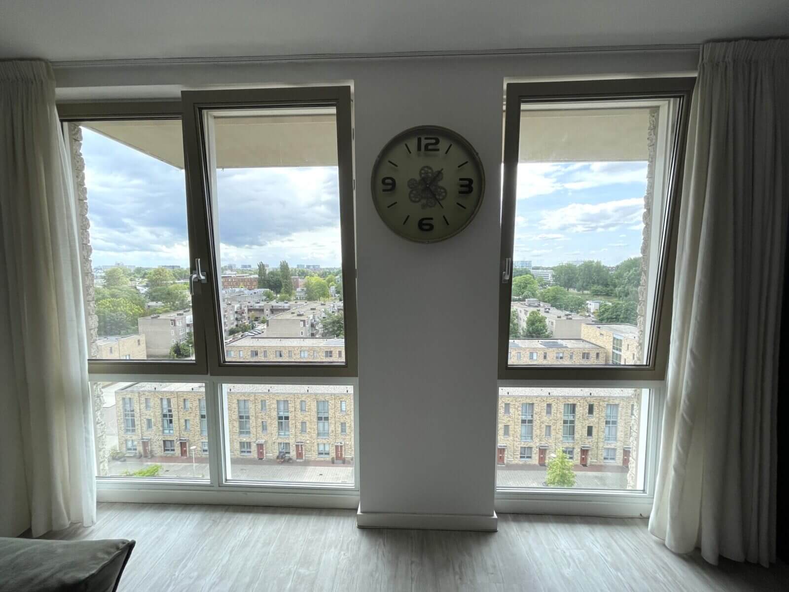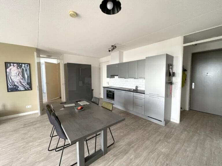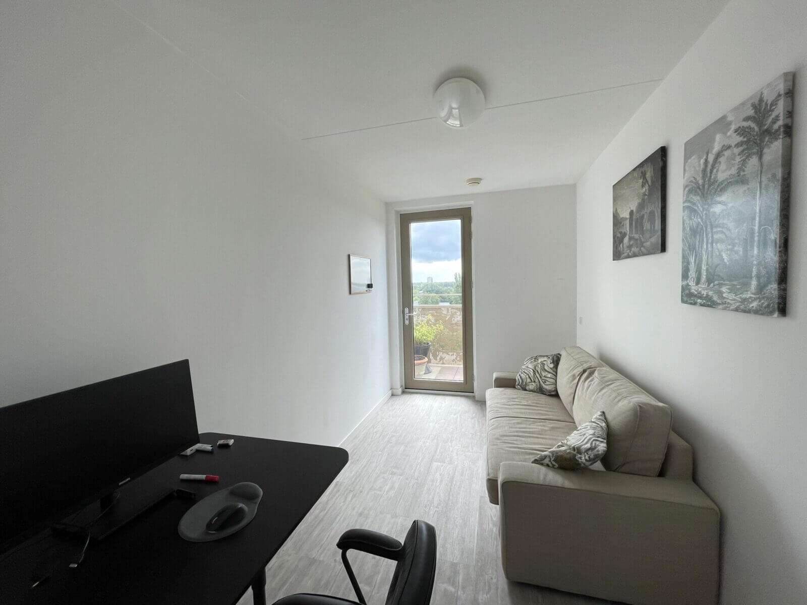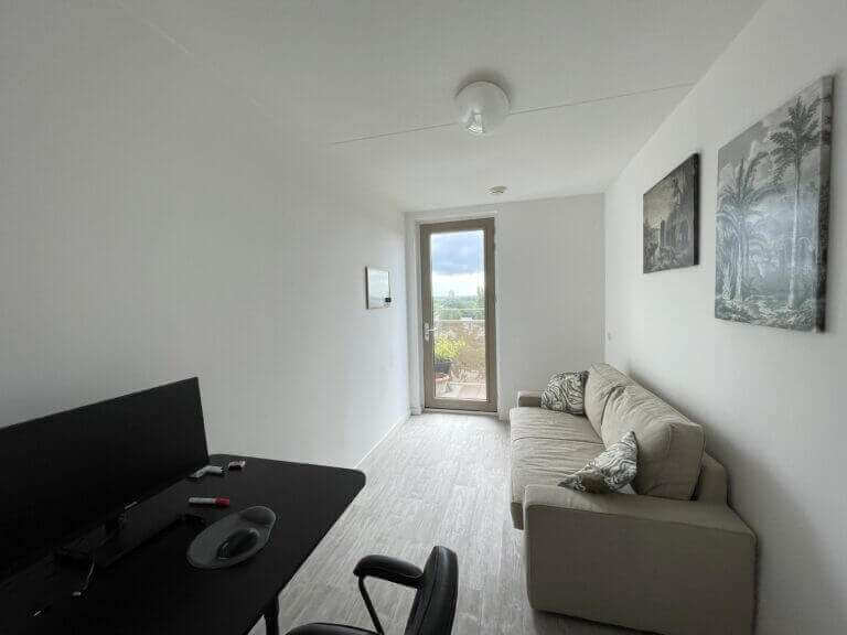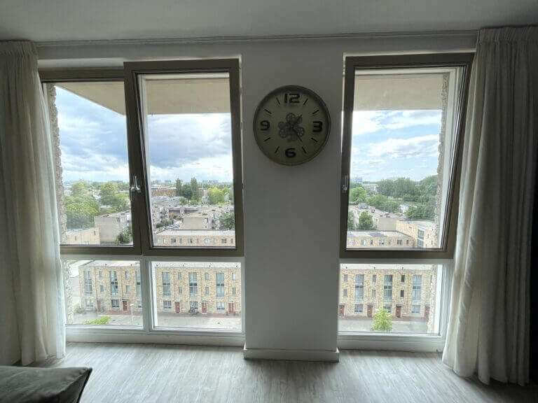 Je komt binnen in een ruime en lichte woonkamer met weids uitzicht over Amsterdam West en het omliggende groen. Er is een moderne open keuken voorzien van een combi-oven, kookplaat, vaatwasser en afzuigkap. Er is een grote slaapkamer en een nette badkamer met inloopdouche en wastafel.