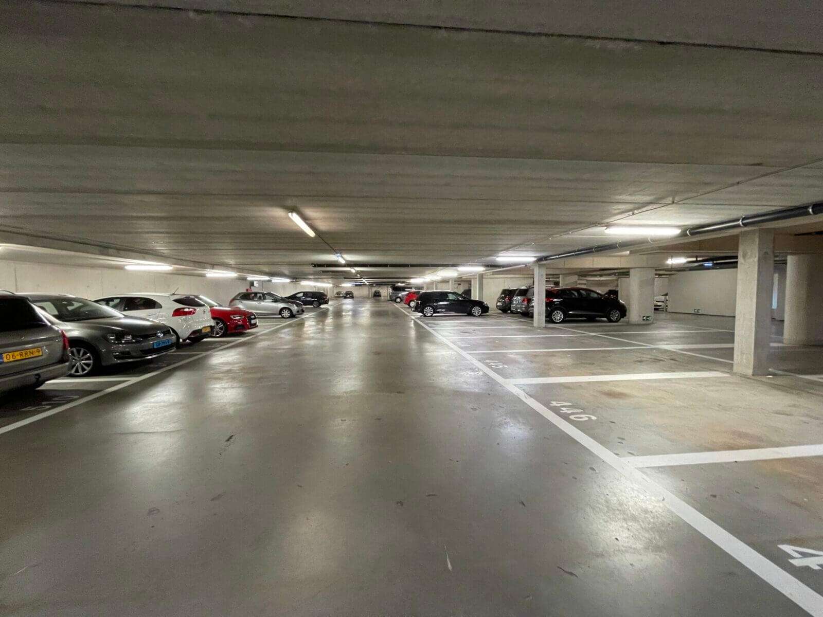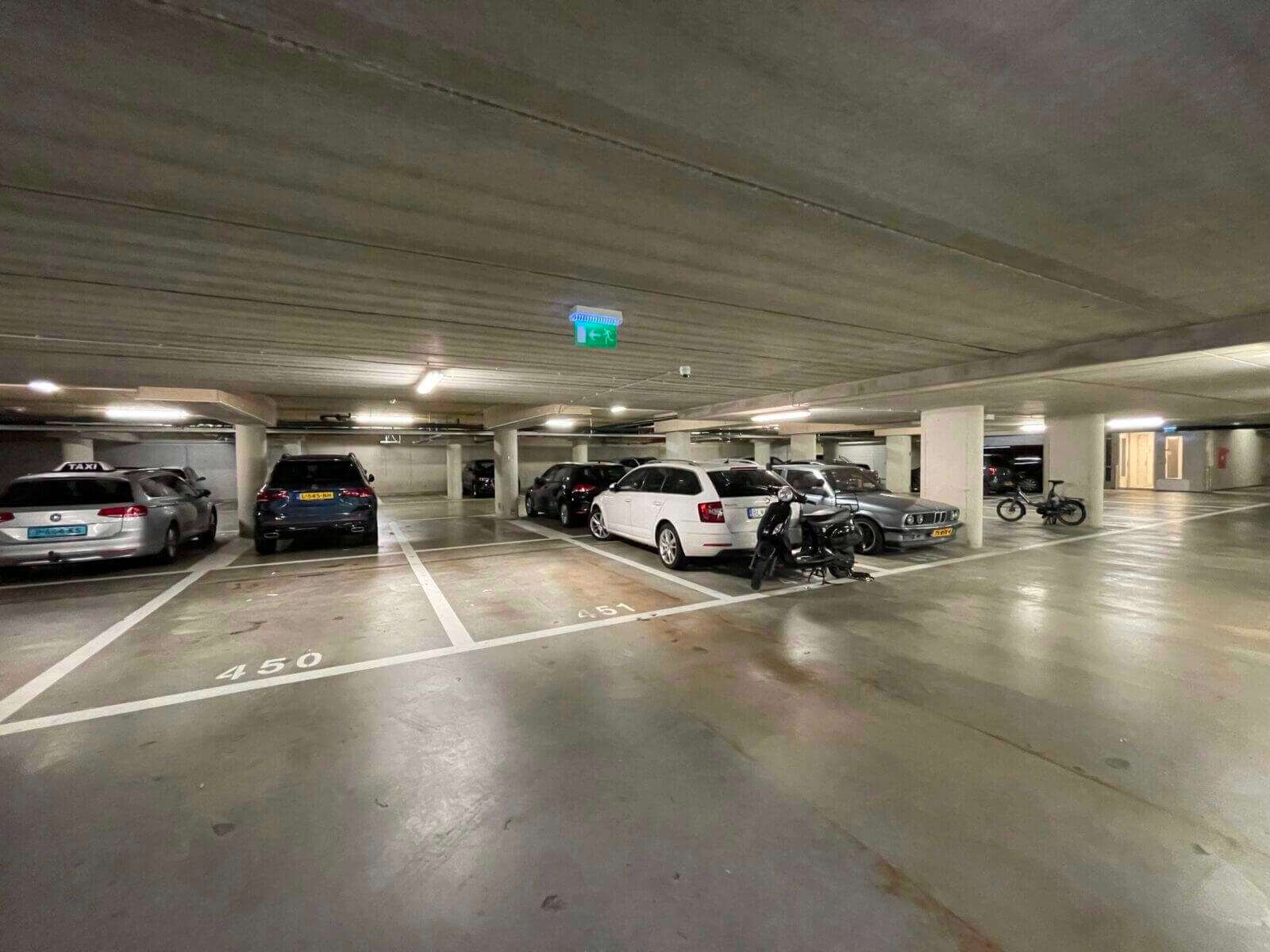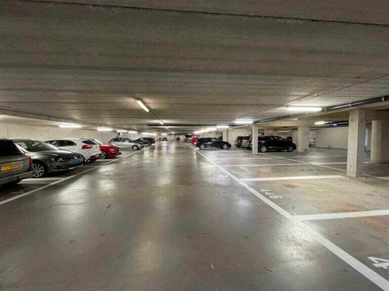 In de onderliggende parkeergarage is een eigen parkeerplek voor de auto en er zijn twee gezamenlijke fietsenstallingen.