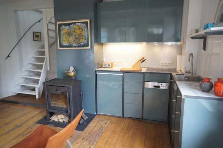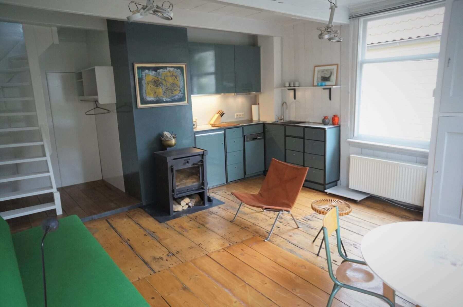 Op dijkniveau kom je via je eigen voordeur binnen in de gezellige woonkeuken met daarin een houthaard.
