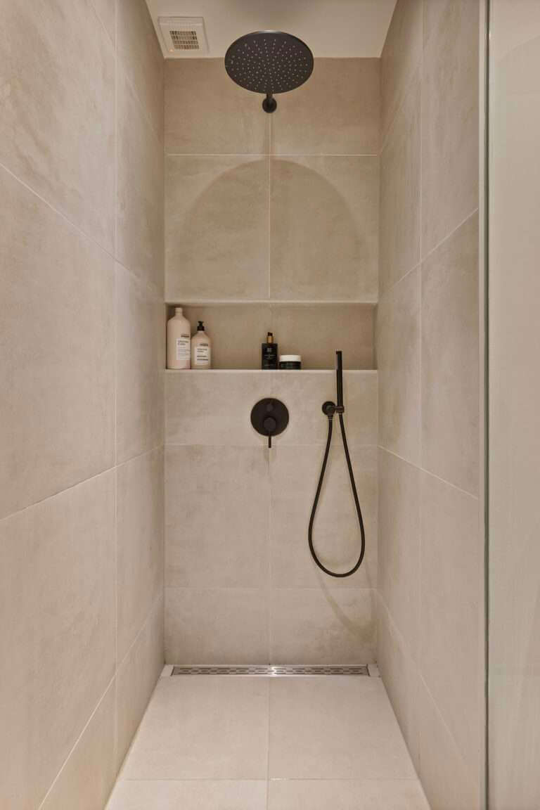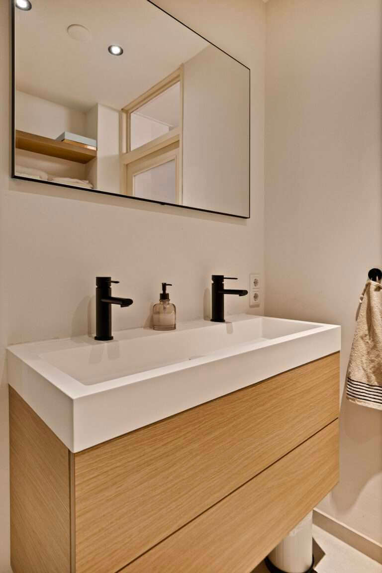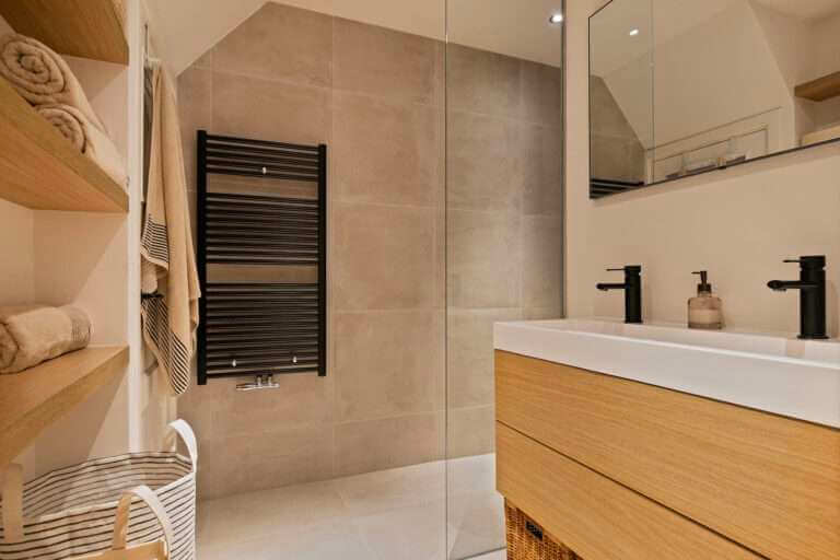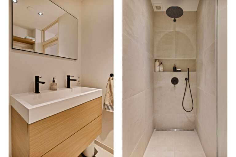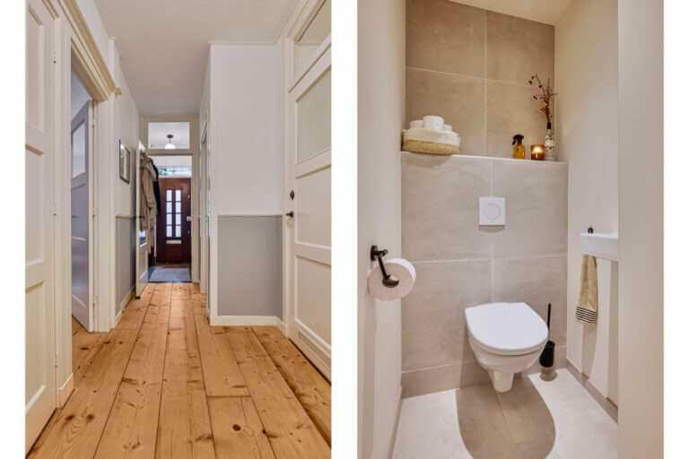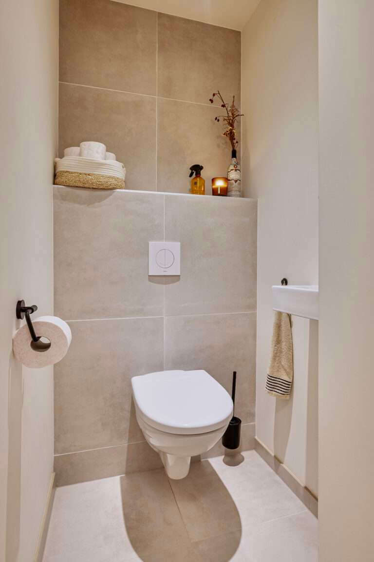 Vanuit de hal is de mooie badkamer met inloopdouche en dubbele wastafel met ombouw bereikbaar. De toegang tot het separate toilet bevindt zich tevens in de hal.