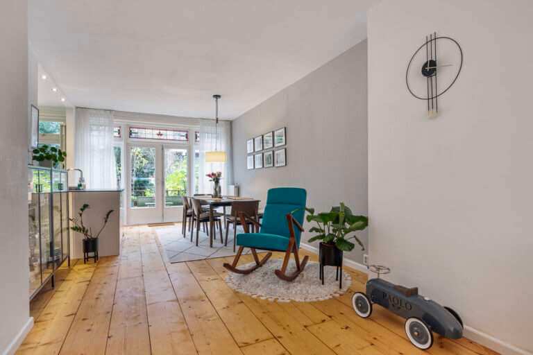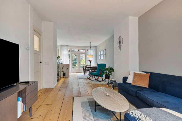 Fijne doorzonwoning gelegen met de woonkamer aan de de voorzijde en de woonkeuken met aangrenzende veranda en verzorgde ruime achtertuin gelegen aan de achterzijde.