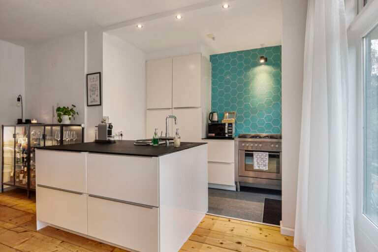 De moderne keuken is volledig ingericht en voorzien van een gaskookplaat, afzuigkap, spoeleiland met spoelbak, vaatwasmachine, koelkast, grote oven, aparte magnetron en veel bergruimte. De vriezer staat momenteel in het tuinhuis. Er is echter ruimte in de keuken om de vriezer daarheen te verplaatsen. Vanuit de keuken heeft u toegang tot een fijne veranda van ongeveer 10 m2 op het noorden waardoor u nog tot laat in de middag kunt genieten van de zon.