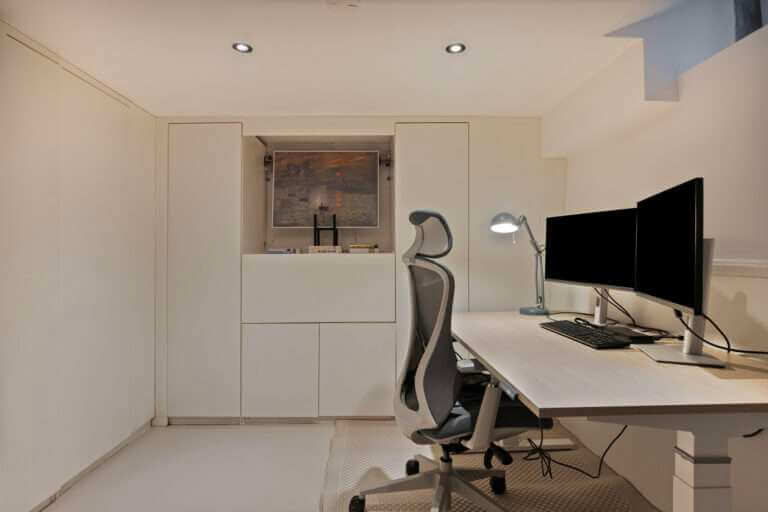 Vanuit de badkamer bereikt u via een vaste trap het souterrain dat in gebruik is als gastenkamer annex kantoorruimte. Hier vindt u tevens een kastenwand en de ruimte voor de wasmachine- droger aansluiting alsmede de opstelling voor de cv ketel.