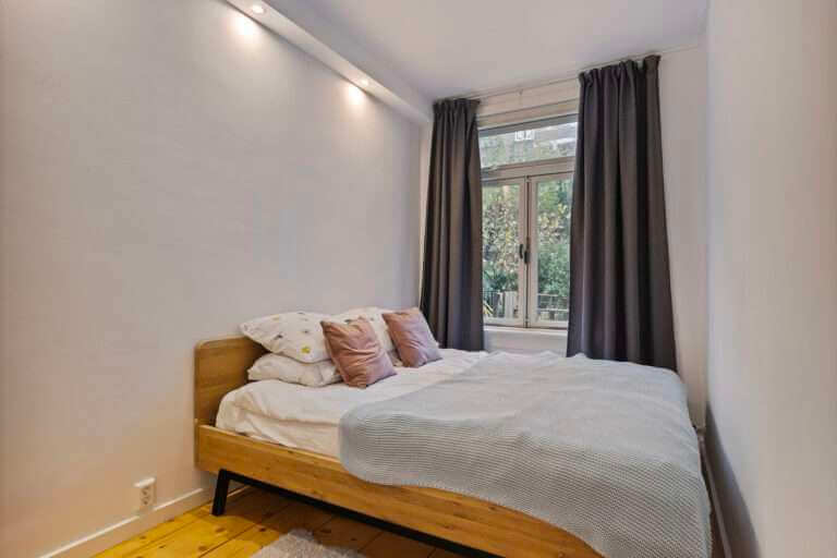 De grote slaapkamer is gelegen aan de achterzijde van de woning. Deze kamer biedt voldoende ruimte voor een tweepersoonsbed en een ladenkast.