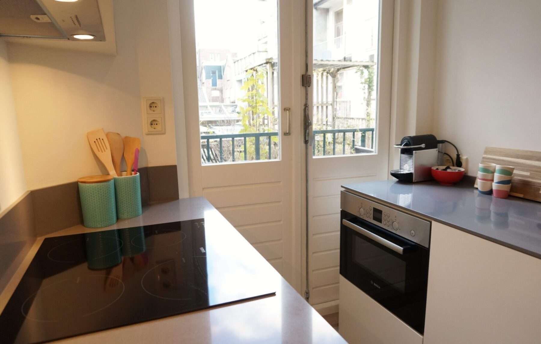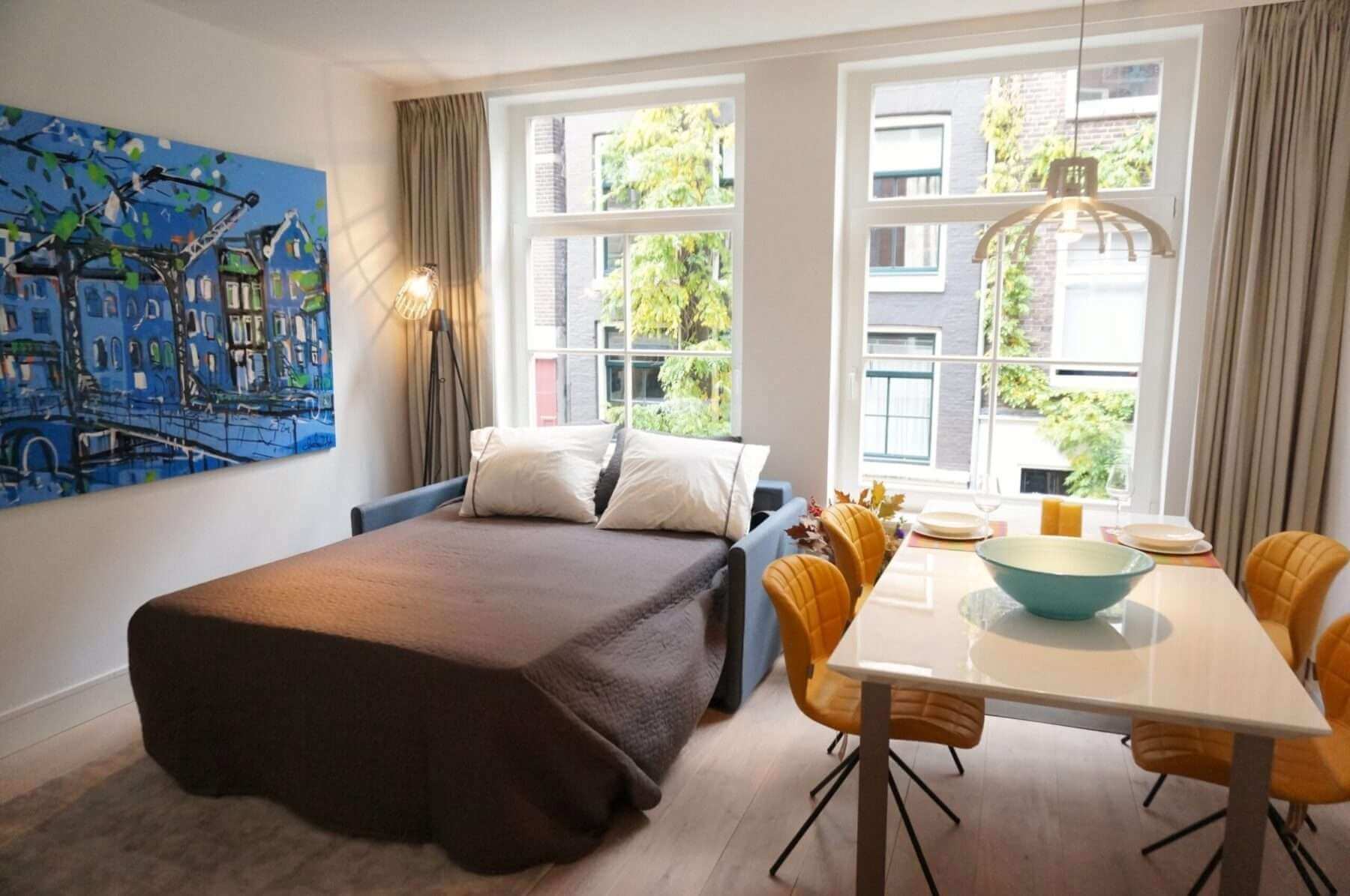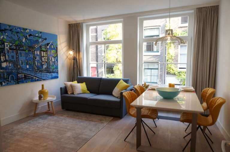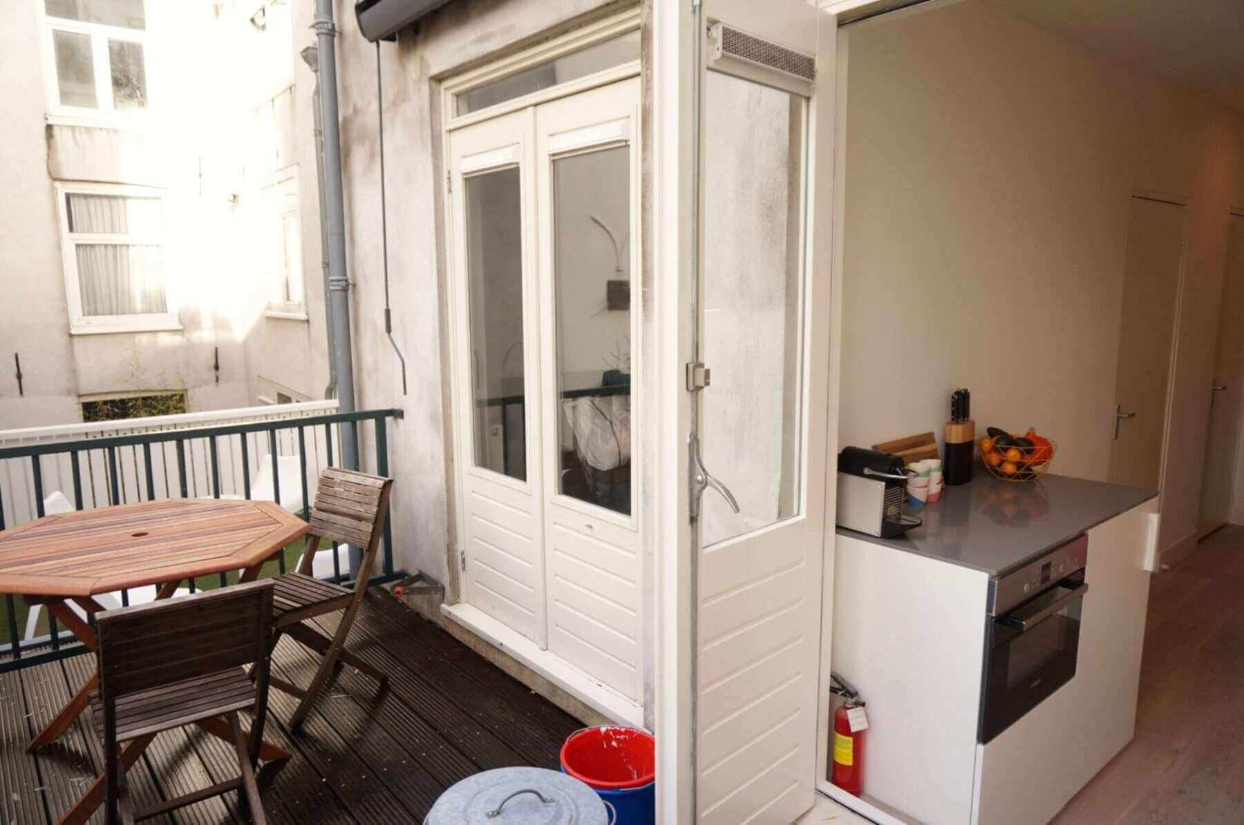 In De Jordaan, nieuw gerenoveerd en stijlvol gemeubileerd high end 2 kamer appartement (1 slaapkamer) met terras.