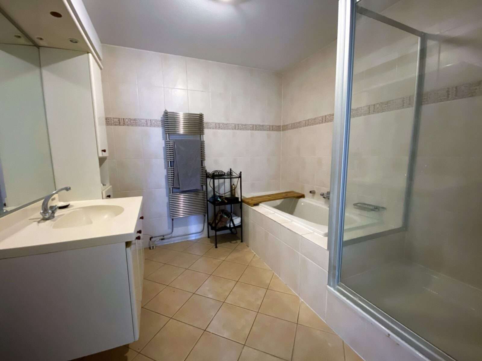 De badkamer is uitgerust met een ligbad, wastafel met meubel een een douchecabine. Er is een apart toilet aanwezig.