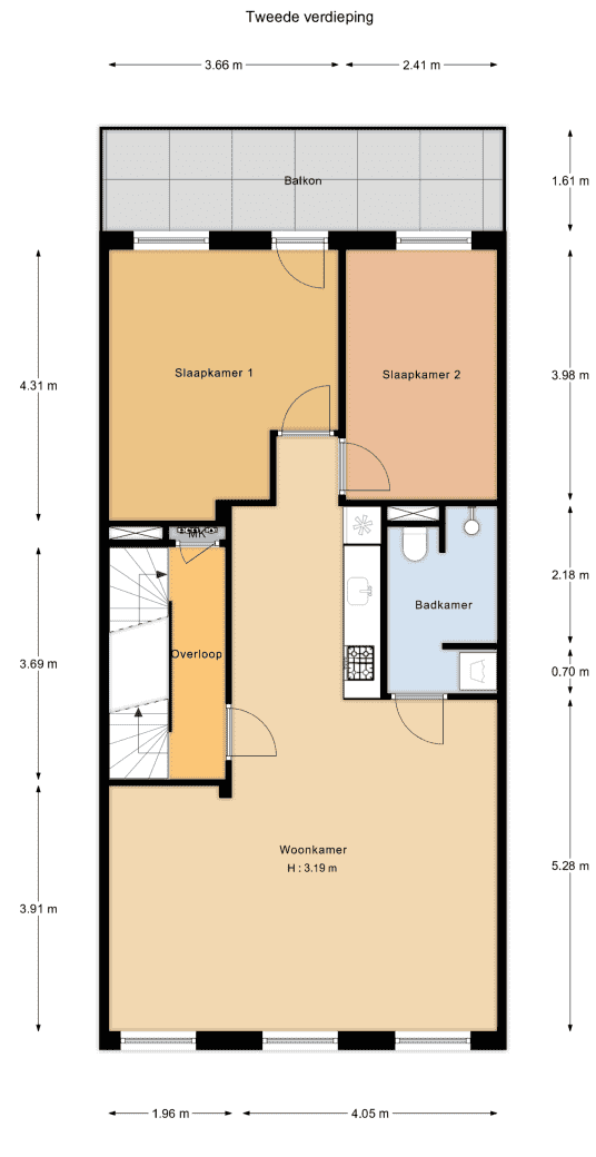 Het appartement op de 2e verdieping beschikt over een balkon. Het appartement op de 3e verdieping heeft geen buitenruimte.