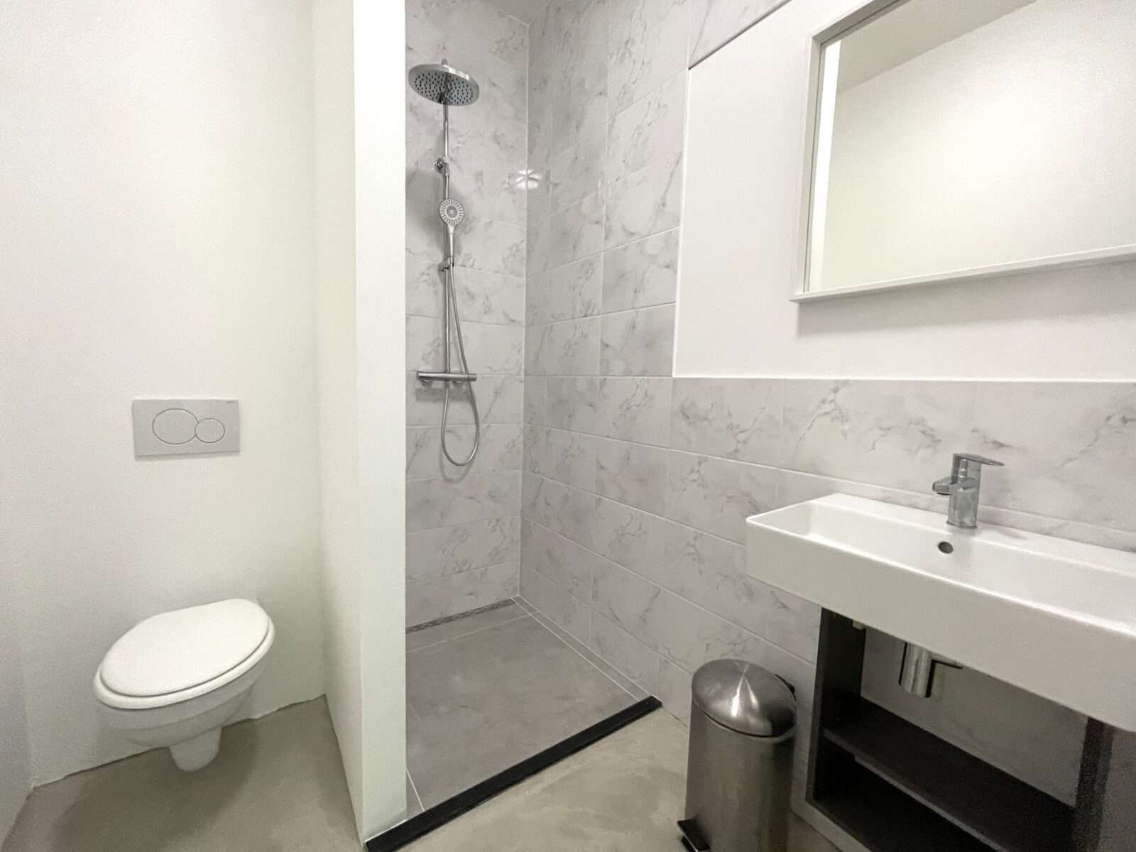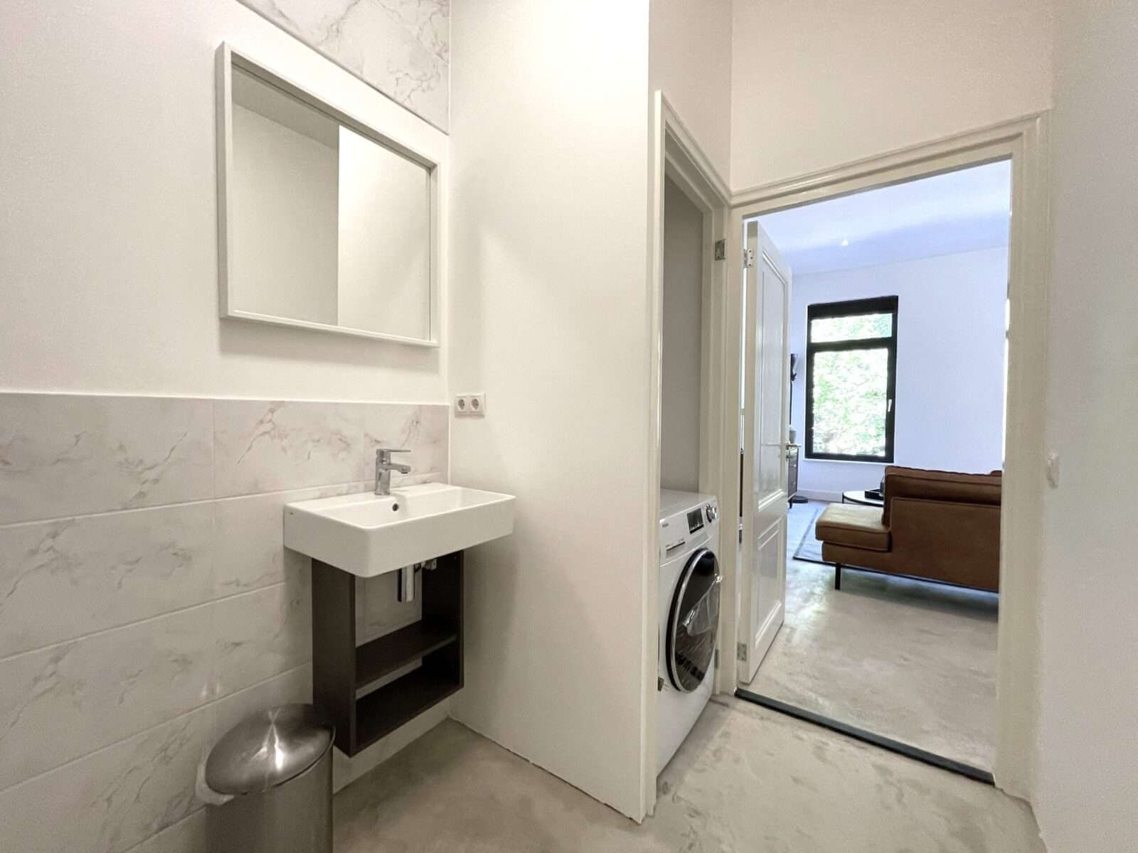 Via de living is de badkamer met wasmachine, wastafelmeubel en inloopdouche te bereiken.